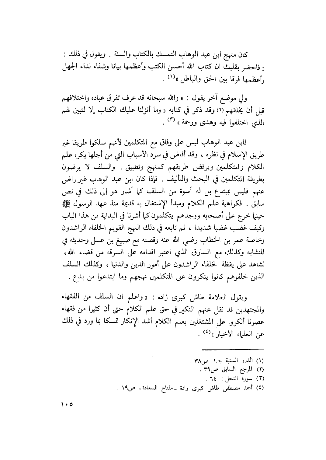 فابن عبد الوهاب ليس على وفاق مع المتكلمين لأنهم سلكوا طريقا غير طريق الإسلام في نظره، وقد أفاض في سرد الأسباب التي من أجلها يكره علم الكلام والمتكلمين ويرفض طريقهم كمنهج وتطبيق، والسلف لا يرضون بطريقة المتكلمين في البحث والتأليف، فإذا كان ابن عبد الوهاب غير راض عنهم فليس بمبتدع بل له أسوة من السلف كما أشار هو إلى ذلك في نص سابق، فكراهية علم الكلام ومبدأ الاشتغال به قديمة منذ عهد الرسول صلى الله عليه وسلم خرج على أصحابه ووجدهم يتكلمون كما أشرنا في البداية من هذا الباب وكيف غضب غضبا شديدا، ثم تابعه في ذلك النهج القويم الخلفاء الراشدون وخاصة عمر بن الخطاب رضي الله عنه وقصته مع صبيغ بن سعل وحديثه في المتشابه وكذلك مع السارق الذي اعتبر إقدامه على السرقة من قضاء الله، لشاهد على يقظة الخلفاء الراشدون على أمور الدين والدنيا، وكذلك السلف الذين خلفوهم كانوا ينكرون على المتكلمين نهجهم وما ابتدعوا من بدع.