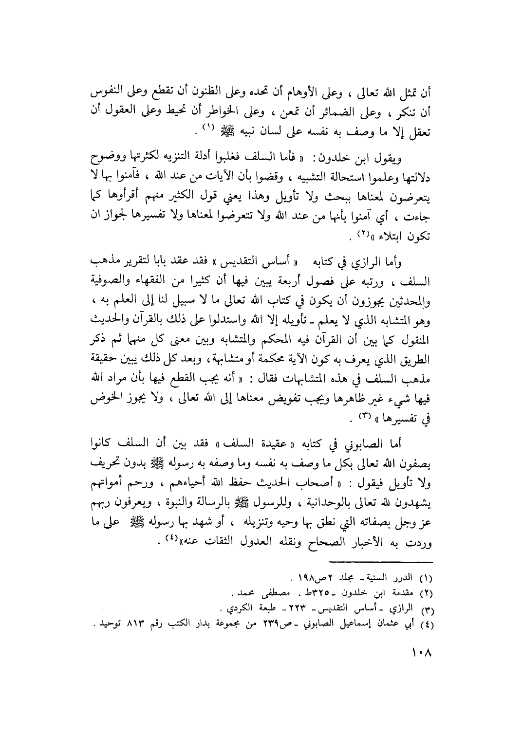ويقول ابن خلدون: " فأما السلف فغلبوا أدلة التنزيه لكثرتها ووضوح دلالتها وعلموا استحالة التشبيه، وقضوا بأن الآيات من عند الله، فآمنوا به لا يتعرضون لمعناها ببحث ولا تأويل وهذا يعنى قول الكثير منهم أقرأوها كما جاءت، أي آمنوا بأنها من عند الله ولا تتعرضا لمعناها ولا تفسيرها لجواز أن تكون ابتلاء". (2)