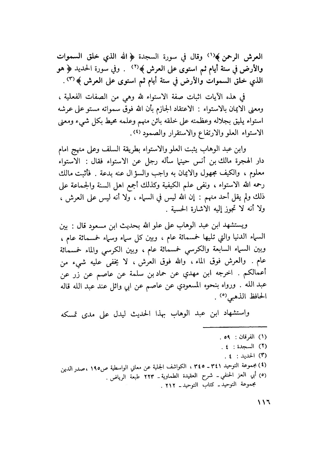 ويستشهد ابن عبد الوهاب على علو الله بحديث ابن مسعود قال: بين السماء الدنيا والتي تليها خمسمائة عام، وبين كل سماء وسماء خمسمائة عام، وبين السماء السابعة والكرسي خمسمائة عام، وبين الكرسي والماء خمسمائة عام والعرش فوق الماء والله فوق العرش، لا يخفى عليه شيء من أعمالكم، أخرجه ابن مهدي عن حماد بن سلمة بن عاصر عن زر عن عبد الله، ورواه بنحوه المسعودي عن عاصم عن أبي وائل عند عبد الله قاله الحافظ الذهبي (5) .
