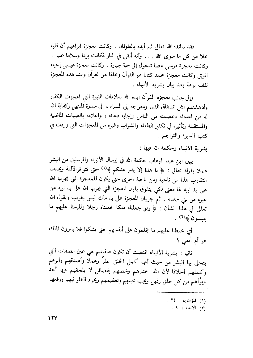 يبين عبد الوهاب حكمة الله في إرسال الأنبياء والمرسلين من البشر عملا بقوله تعالى: {مَا هَذَا إِلَّا بَشَرٌ مِثْلُكُمْ} (1) حتى تتوافر الالفة ويحدث التقارب هذا من ناحية ومن ناحية الاخرى حتى يكون للمعجزة التي يجريها الله على يد نبيه لها معنى لكي تفوق بلوم المعجزة على يد ملك ليس بغريب ويقول الله تعالى في هذا الشأن {وَلَوْ جَعَلْنَاهُ مَلَكاً لَجَعَلْنَاهُ رَجُلاً وَلَلَبَسْنَا عَلَيْهِمْ مَا يَلْبِسُونَ} (2) .