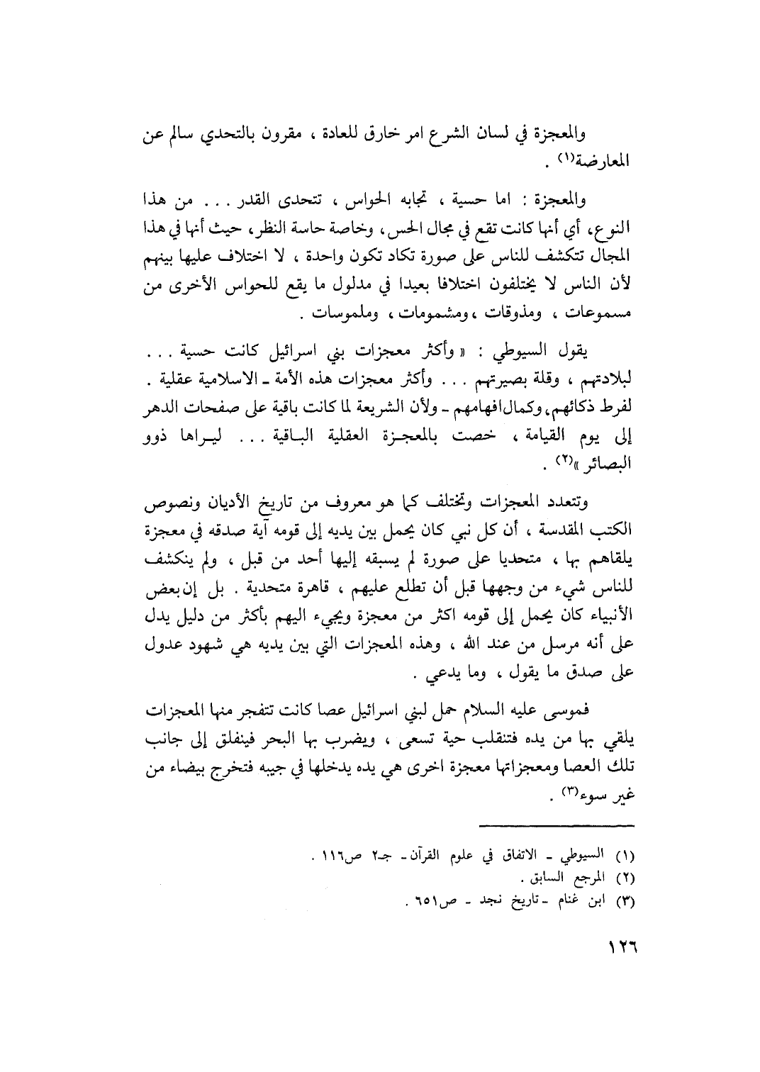 يقول السيوطي: (وأكثر معجزات بني إسرائيل كانت حسية ... لبلادتهم، وقلة بصيرتهم ... وأكثر معجزات هذه الأمة ـ الإسلامية عقلية لفرط ذكائهم، وكمال إفهامهم ـ ولأن الشريعة لما كانت باقية على صفحات الدهر إلى يوم القيامة، خصت بالمعجزة العقلية الباقية.. ليراها ذوو البصائر) (2)