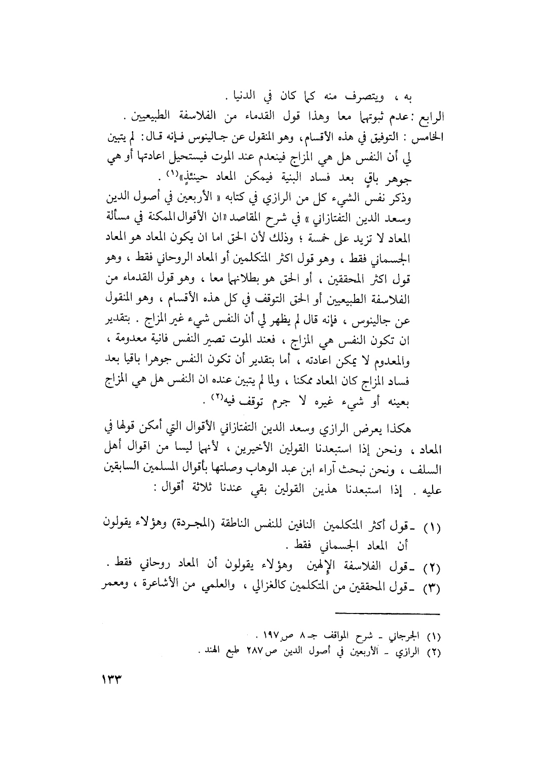 هكذا يعرض الرازي وسعد الدين التفتازاني الأقوال التي أمكن قولها في المعاد، ونحن إذا استبعدنا القولين الأخيرين، لأنهما ليسا من أقوال أهل السلف، ونحن نبحث آراء ابن عبد الوهاب وصلتها بأقوال المسلمين السابقين عليه، إذا استبعدنا هذين القولين بقي عندنا ثلاثة أقوال: