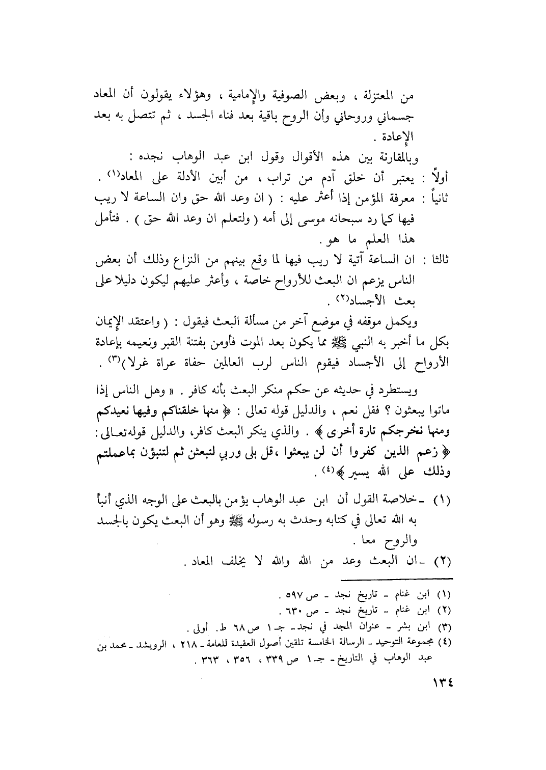 (1) - خلاصة القول أن ابن عبد الوهاب يؤمن بالبعث على الوجه الذي أنبأ به الله تعالى في كتابه وحدث به رسوله صلى الله عليه وسلم وهو أن البعث يكون بالجسد والروح معاً.