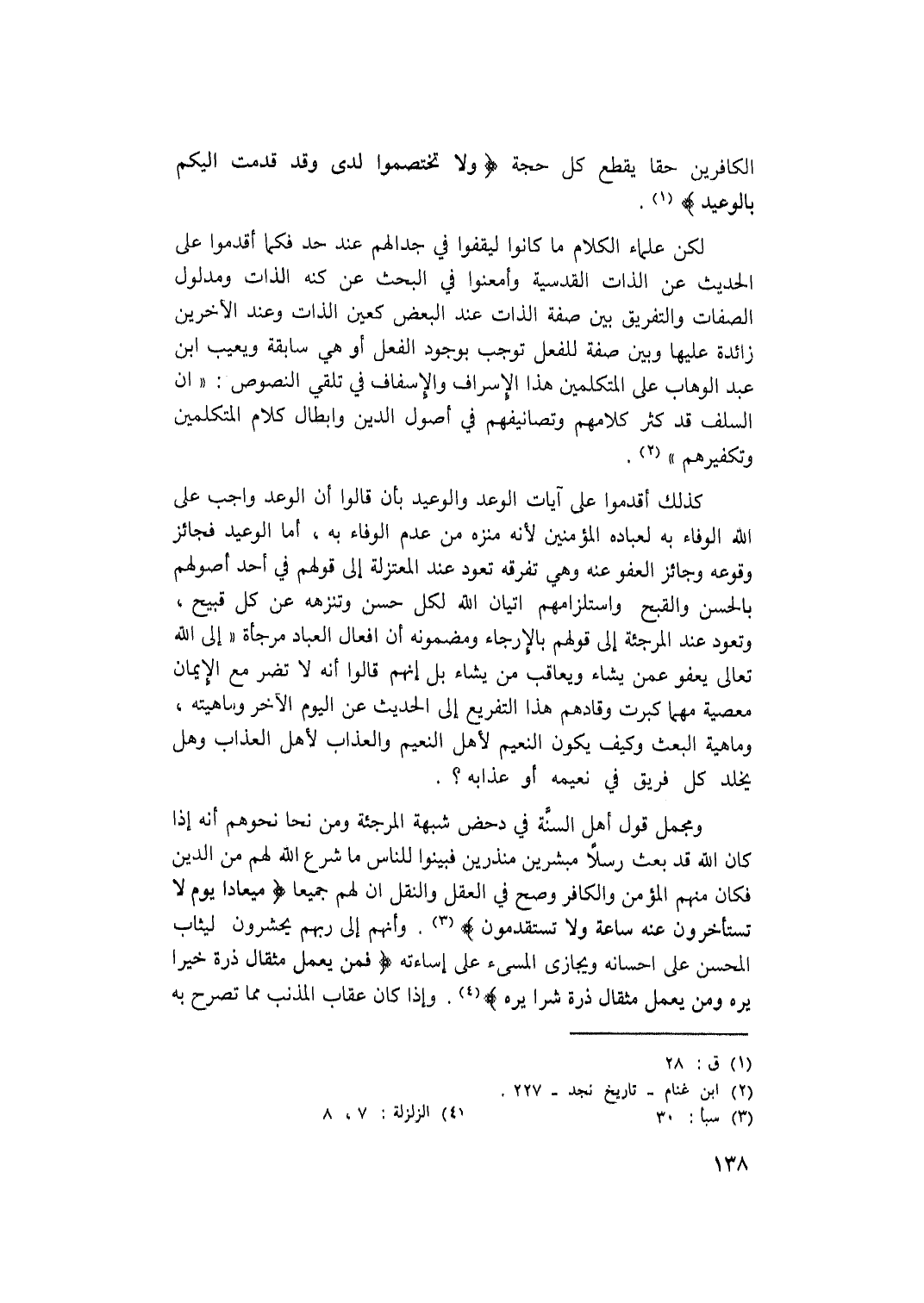 لكن علماء الكلام ما كانوا ليقفوا في جدالهم عند حد فكما أقدموا على الحديث عن الذات القدسية وأمعنوا في البحث عن كنه الذات ومدلول الصفات والتفريق بين صفة الذات عند البعض كعين الذات وعند الآخرين زائدة عليها وبين صفة للفعل توجب بوجود الفعل أو هي سابقو ويعيب ابن عبد الوهاب على المتكلمين هذا الإسراف والإسفاف في تلقي النصوص: (إن السلف قد كثر كلامهم وتصانيفهم في أصول الدين وإبطال كلام المتكلمين وتكفيرهم) (2) .