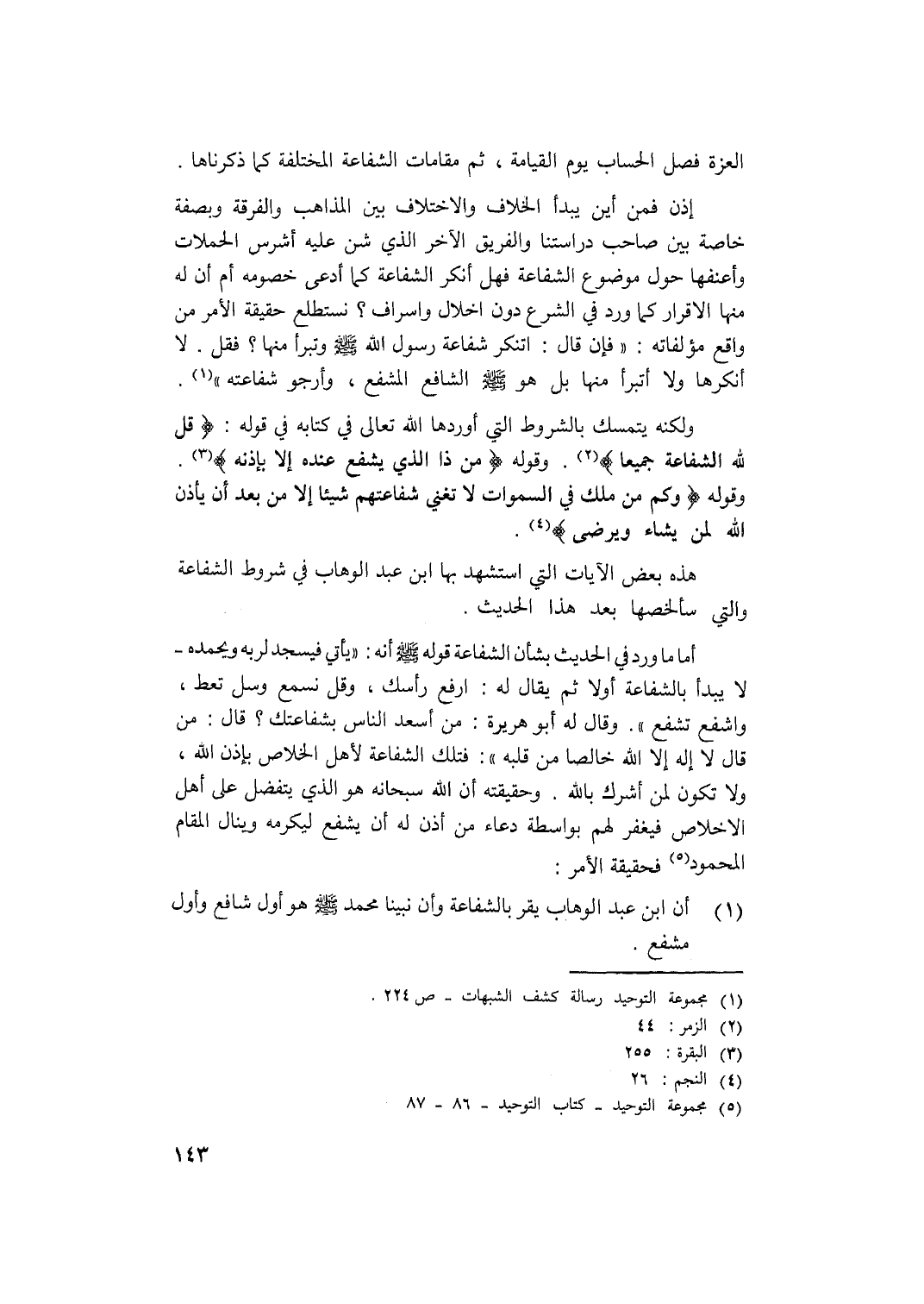 (1) أن ابن عبد الوهاب يقر بالشافعة وان نبينا محمد صلى الله عليه وسلم هو أول شافع وأول مشفع.