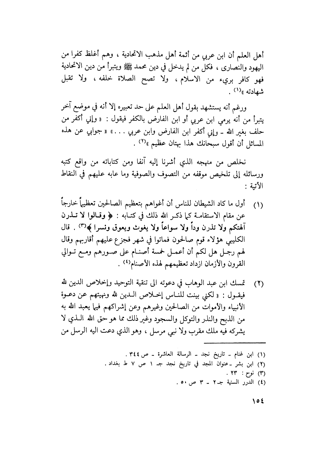 ورغم أنه يستشهد بقول أهل العلم على حد تعبيره إلا أنه في موضع آخر يتبرأ من أنه يرمي ابن عربي أو ابن الفارض بالكفر فيقول:" وإني أكفر من حلف بغير الله ـ وإني أكفر ابن الفارض وابن عربي ... "جوابي عن هذه المسائل أن أقول سبحانك هذا بهتان عظيم". (2)