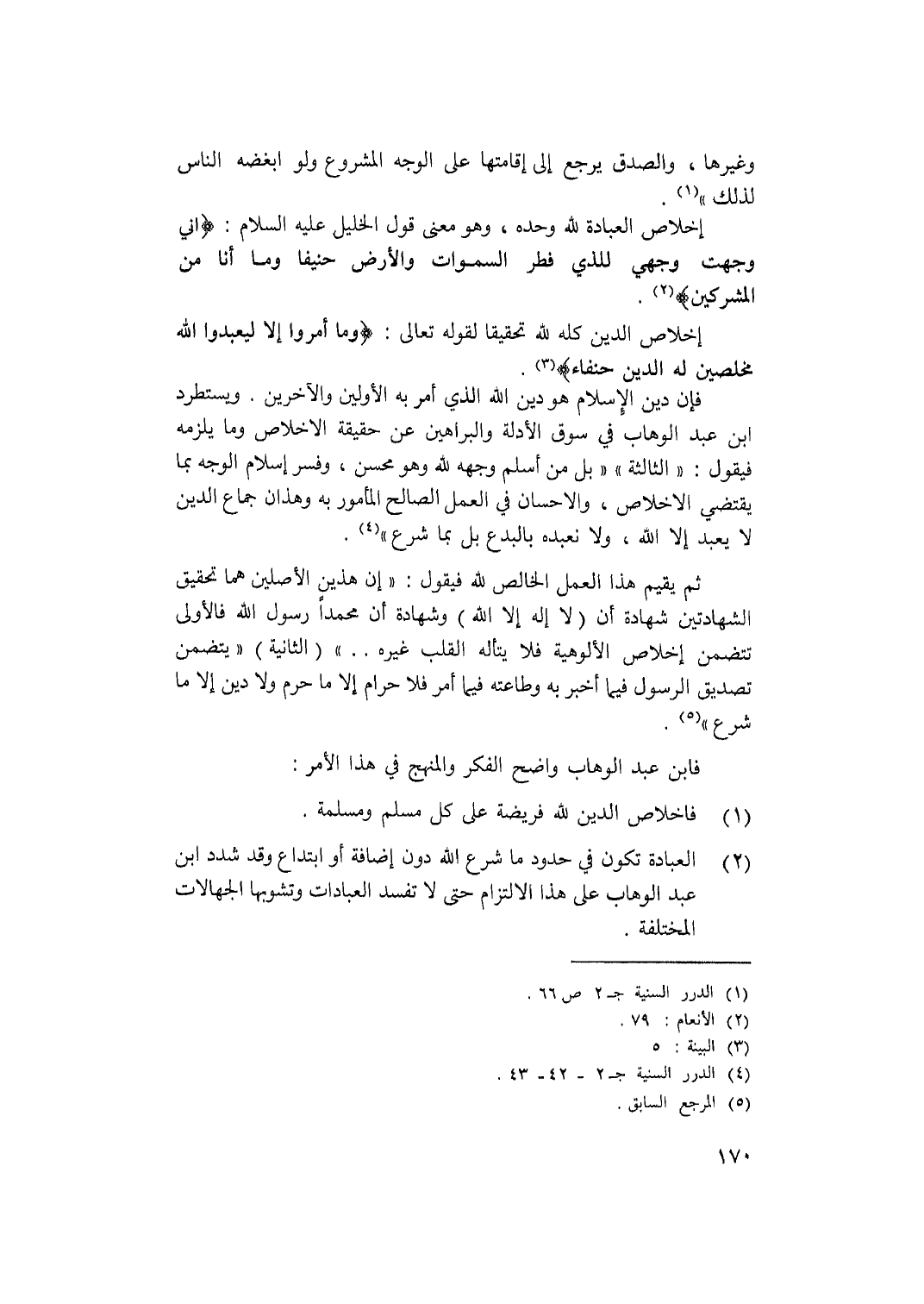فإن دين الإسلام هو دين الله الذي أمر به الأولين والآخرين، ويستطرد ابن عبد الوهاب في سوق الأدلة والبراهين عن حقيقة الإخلاص وما يلزمه فيقول:"الثالثة" بل من أسلم وجهه لله وهو محسن، وفسر إسلام الوجه بما يقتضي الإخلاص، والإحسان في العمل الصالح المأمور به وهذان جماع الدين لا يعبد إلا الله، ولا نعبده بالبدع بل بما شرع". (4)