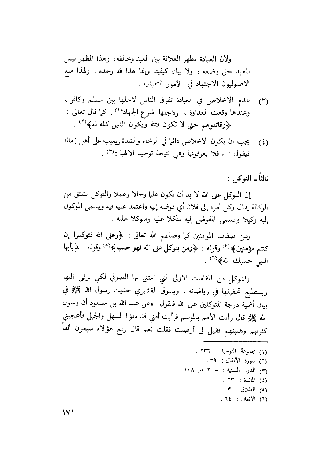 (2) يجب ان يكون الإخلاص دائما في الرخاء والشدة ويعيب على أهل زمانه فيقول:"فلا يعرفونها وهي نتيجة توحيد الإلهية. (3)