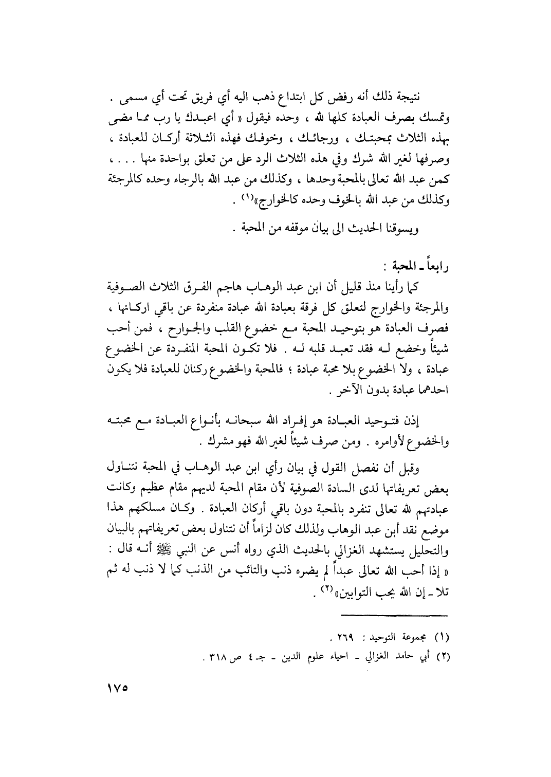 وقبل أن نفصل القول في بيان رأي ابن عبد الوهاب في المحبة نتناول بعض تعريفاتها لدى السادة الصوفية لأن مقام المحبة لديهم مقام عظيم وكانت عبادتهم لله تعالى تنفرد بالمحبة دون باقي أركان العبادة، وكان مسلكهم هذا موضع نقد ابن عبد الوهاب ولذلك كان لزاما أن نتناول بعض تعريفاتهم بالبيان والتحليل يستشهد الغزالي بالحديث الذي رواه أنس عن النبي رسول الله صلى الله عليه وسلم أنه قال:" إذا أحب الله عبد الم يضره ذنب والتائب من الذنب كما لا ذنب له ثم تلا ـ {إن الله يحب التوابين} ". (2)