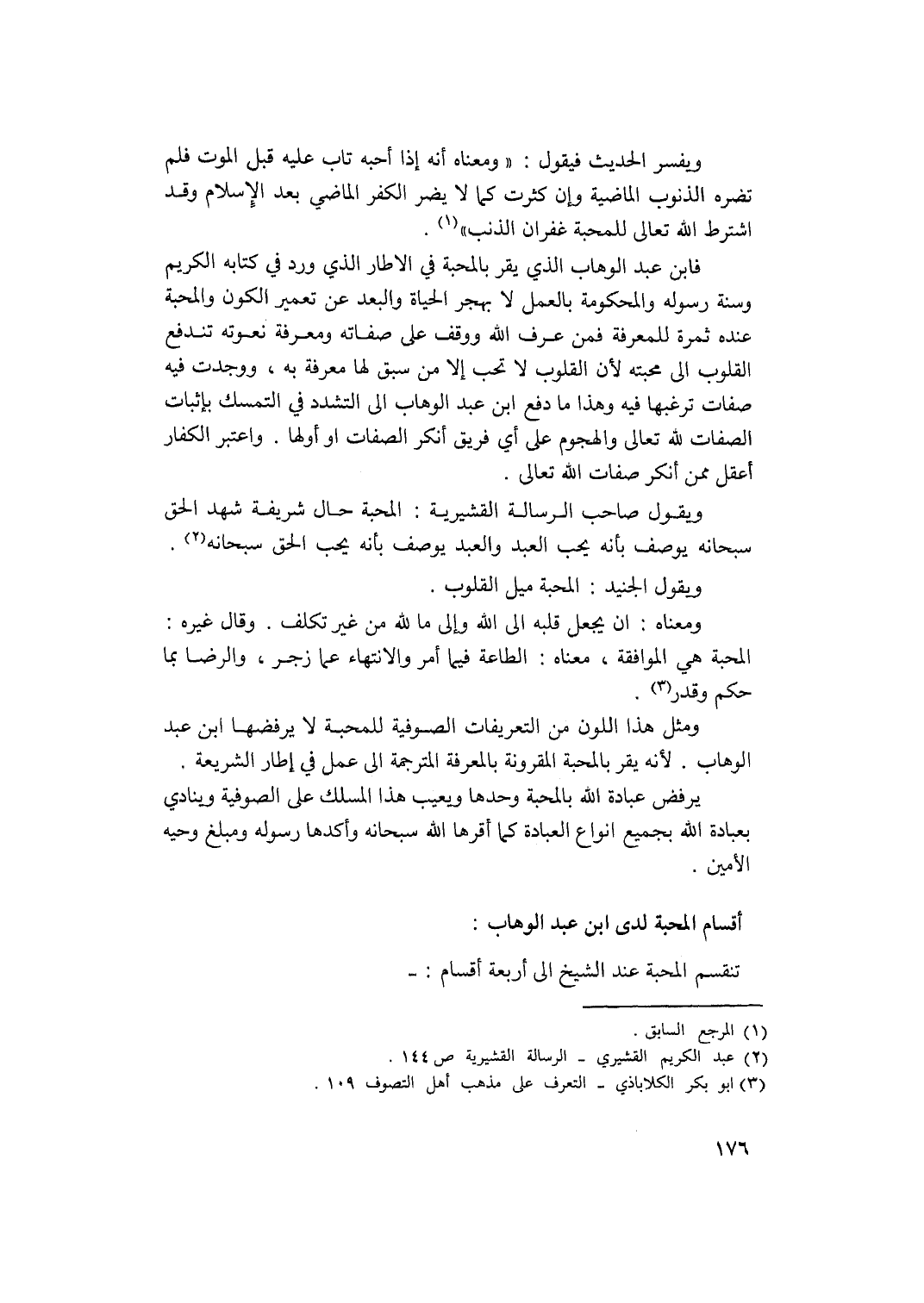 ومثل هذا اللهو من التعريفات الصوفية للمحبة لا يرفضها ابن عبد الوهاب، لأنه يقر بالمحبة المقرونة بالمعرفة المترجمة إلى عمل في إطار الشريعة.