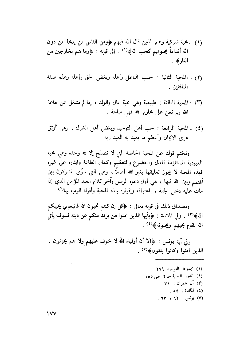 1- محبة شركية وهم الذين قال الله فيهم {وَمِنَ النَّاسِ مَنْ يَتَّخِذُ مِنْ دُونِ اللَّهِ أَنْدَاداً يُحِبُّونَهُمْ كَحُبِّ اللَّهِ} (1) إلى قوله {وَمَا هُمْ بِخَارِجِينَ مِنَ النَّارِ} .
