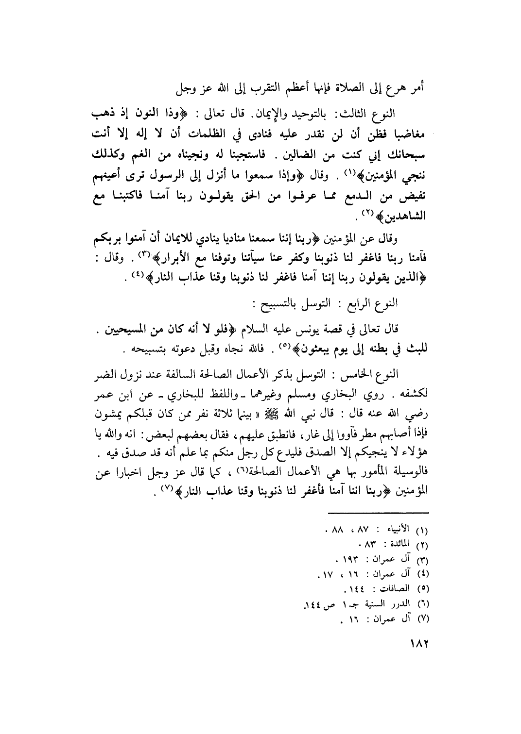 النوع الثالث: بالتوحيد والإيمان، قال تعالى: {وَذَا النُّونِ إِذْ ذَهَبَ مُغَاضِباً فَظَنَّ أَنْ لَنْ نَقْدِرَ عَلَيْهِ فَنَادَى فِي الظُّلُمَاتِ أَنْ لا إِلَهَ إِلَّا أَنْتَ سُبْحَانَكَ إِنِّي كُنْتُ مِنَ الظَّالِمِينَ، فَاسْتَجَبْنَا لَهُ وَنَجَّيْنَاهُ مِنَ الْغَمِّ وَكَذَلِكَ نُنْجِي الْمُؤْمِنِينَ} (1) وقال: {وَإِذَا سَمِعُوا مَا أُنْزِلَ إِلَى الرَّسُولِ تَرَى أَعْيُنَهُمْ تَفِيضُ مِنَ الدَّمْعِ مِمَّا عَرَفُوا مِنَ الْحَقِّ يَقُولُونَ رَبَّنَا آمَنَّا فَاكْتُبْنَا مَعَ الشَّاهِدِينَ} (2) وقال عن المؤمنين: {رَبَّنَا إِنَّنَا سَمِعْنَا مُنَادِياً يُنَادِي لِلْإِيمَانِ أَنْ آمِنُوا بِرَبِّكُمْ فَآمَنَّا رَبَّنَا فَاغْفِرْ لَنَا ذُنُوبَنَا وَكَفِّرْ عَنَّا سَيِّئَاتِنَا وَتَوَفَّنَا مَعَ الْأَبْرَارِ} . (3) وقال: {الَّذِينَ يَقُولُونَ رَبَّنَا إِنَّنَا آمَنَّا فَاغْفِرْ لَنَا ذُنُوبَنَا وَقِنَا عَذَابَ النَّارِ} (4)