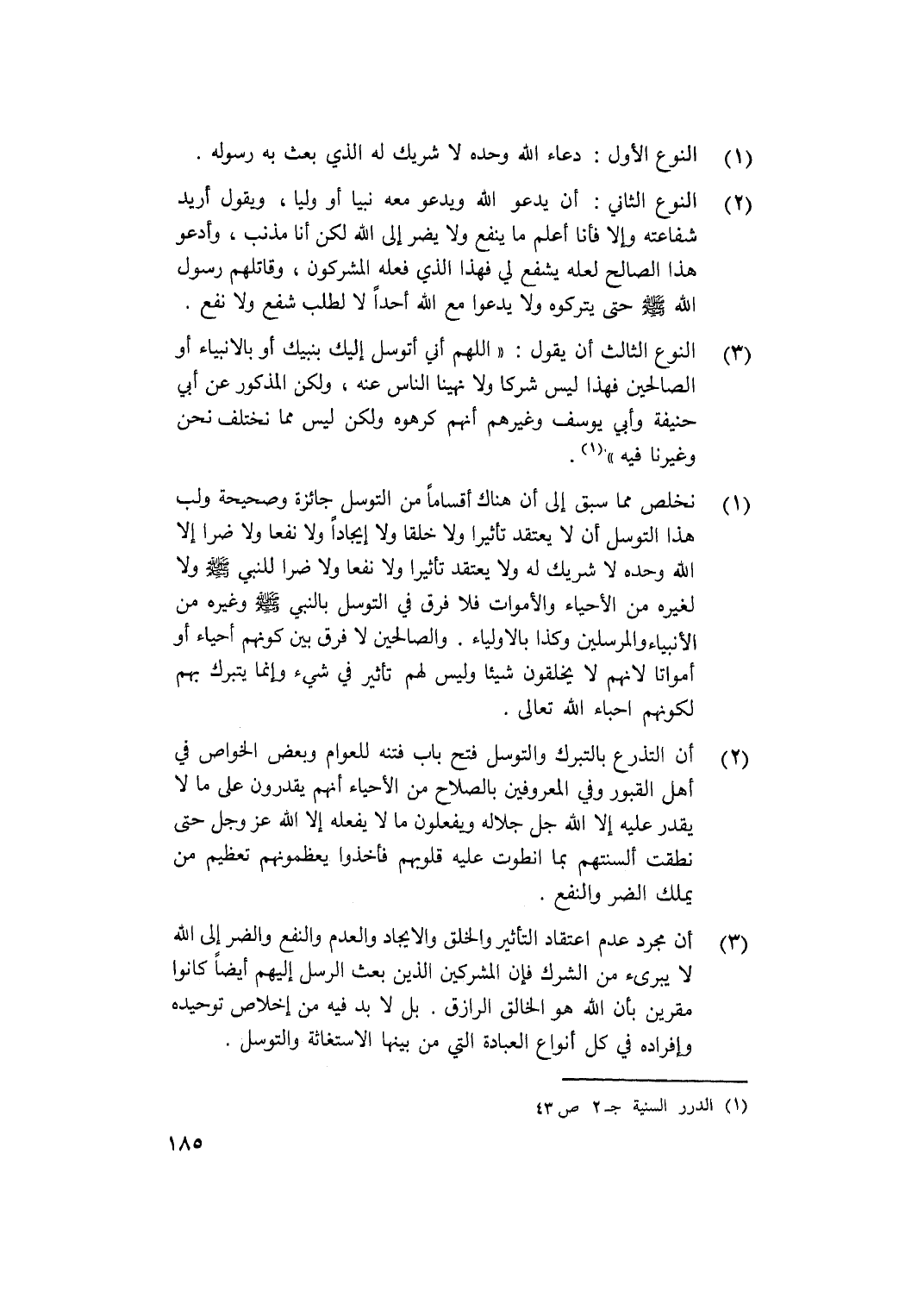 (3) النوع الثالث: أن يقول:" اللهم أني أتوسل إليك بنبيك أو بالأنبياء أو لصالحين فهذا ليس شركا ولا نهينا الناس عنه، ولكن المذكور عن أبى حنيفة وأبي يوسف وغيرهم انهم كرهوه ولكن ليس مما نختلف نحن وغيرنا فيه". (1)