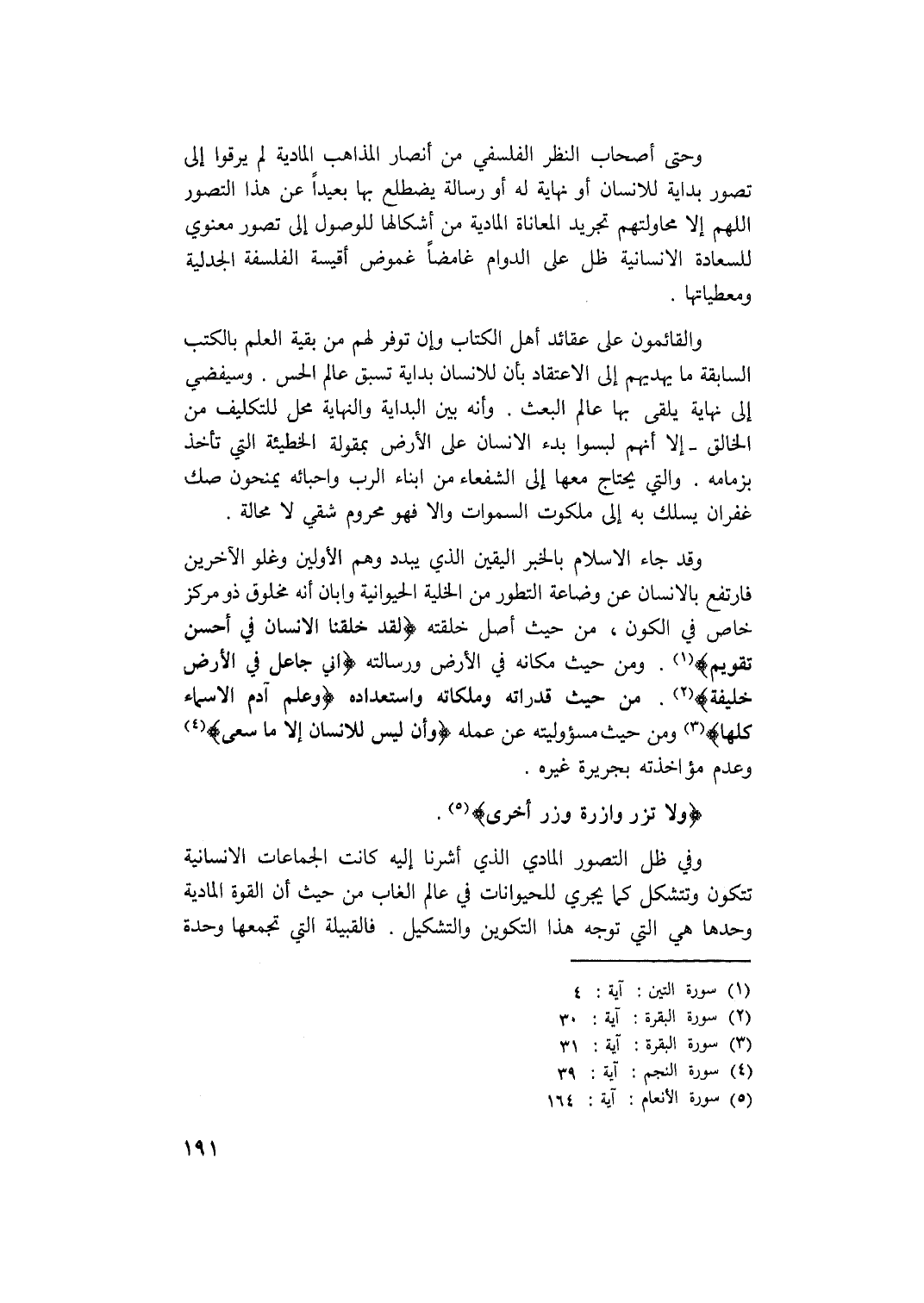 وحتى أصحاب النظر الفلسفي من أنصار المذاهب المادية لم يرقوا إلى تصور بداية للإنسان أو نهاية له أو رسالة يضطلع بها بعيدا عن هذا التصور اللهم إلا محاولتهم تجريد المعاناة المادية من أشكالها للوصول إلى تصور معنوي للسعادة الإنسانية ظل على الدوام غامضا غموض أقيسة الفلسفة الجدلية ومعطياتها.