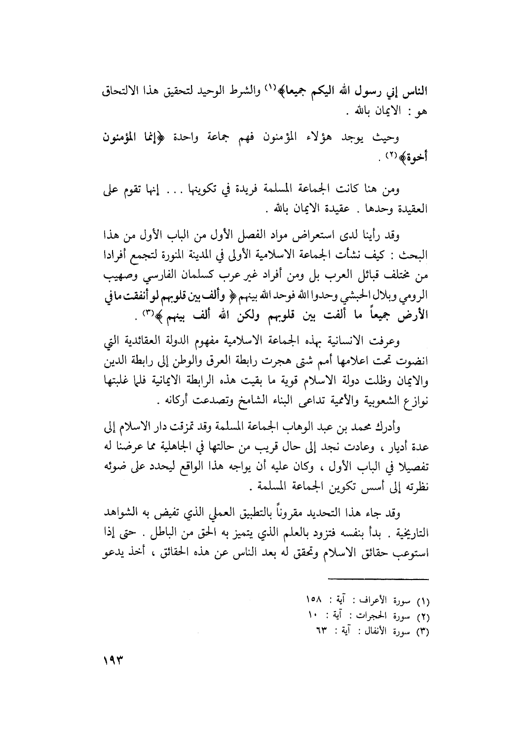 وقد رأينا لدى استعراض مواد الفصل الأول من الباب الأول من هذا البحث: كيف نشأت الجماعة الإسلامية الأولى في المدينة المنورة لتجمع أفرادا ومن مختلف قبائل العرب بل ومن أفراد غير عرب كسلمان الفارسي وصهيب الرومي وبلال الحبشي وحدوا الله فوحد الله بينهم {وَأَلَّفَ بَيْنَ قُلُوبِهِمْ لَوْ أَنْفَقْتَ مَا فِي الْأَرْضِ جَمِيعاً مَا أَلَّفْتَ بَيْنَ قُلُوبِهِمْ وَلَكِنَّ اللَّهَ أَلَّفَ بَيْنَهُمْ} . (3)