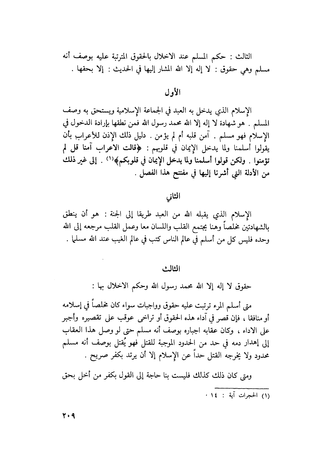 الإسلام الذي يدخل به العبد في الجماعة الإسلامية ويستحق به وصف المسلم. شهادة لا إله إلا الله محمد رسول الله فمن نطقها بإرادة الدخول في الإسلام فهو مسلم. آمن قلبه أم لم يؤمن. دليل ذلك الإذن للأعراب بأن يقولوا أسلمنا ولما يدخل الإيمان في قلوبهم: {قَالَتِ الْأَعْرَابُ آمَنَّا قُلْ لَمْ تُؤْمِنُوا وَلَكِنْ قُولُوا أَسْلَمْنَا وَلَمَّا يَدْخُلِ الْأِيمَانُ فِي قُلُوبِكُمْ} 1.إلى غير ذلك من الأدلة التي أشرنا إليها في مفتتح هذا الفصل.