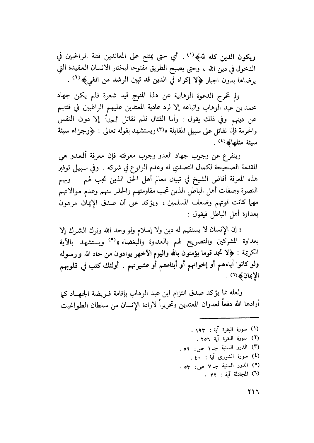 ولعله مما يؤكد صدق التزام أبن عبد الوهاب بإقامة فريضة الجهاد كما أرادها الله دفعا لعدوان المعتدين وتحريراً لإرادة الإنسان من سلطان الطواغيت.
