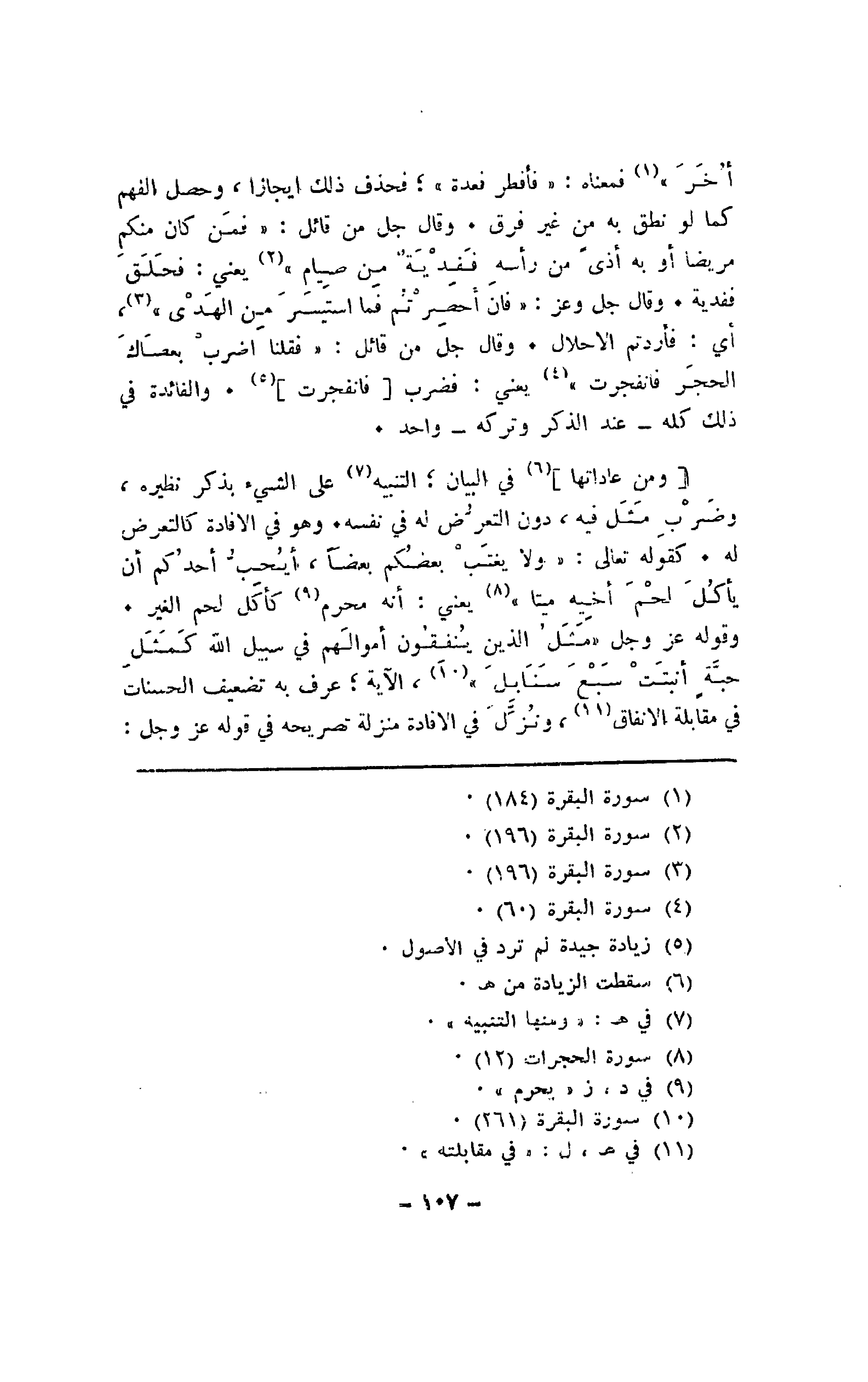 [ومن عاداتها] في البيان؛ النبيه على الشيء بذكر نظيره، وضرب مثل فيه، دون التعرض له في نفسه. وهو في الإفادة كالتعرض له. كقوله تعالى: {ولا يغتب بعضكم بعضاً، أيحب أحدكم أن يأكل لحم أخيه ميتاً} يعني: أنه محرم كأكل لحم الغير. وقوله عز وجل {مثل الذين ينفقون أموالهم في سبيل الله كمثل حبة أنبتت سبع سنابل}، الآية؛ عرف به تضعيف الحسنات في مقابلة الإنفاق، ونزل في الإفادة منزلة تصريحه في قوله عز وجل:
