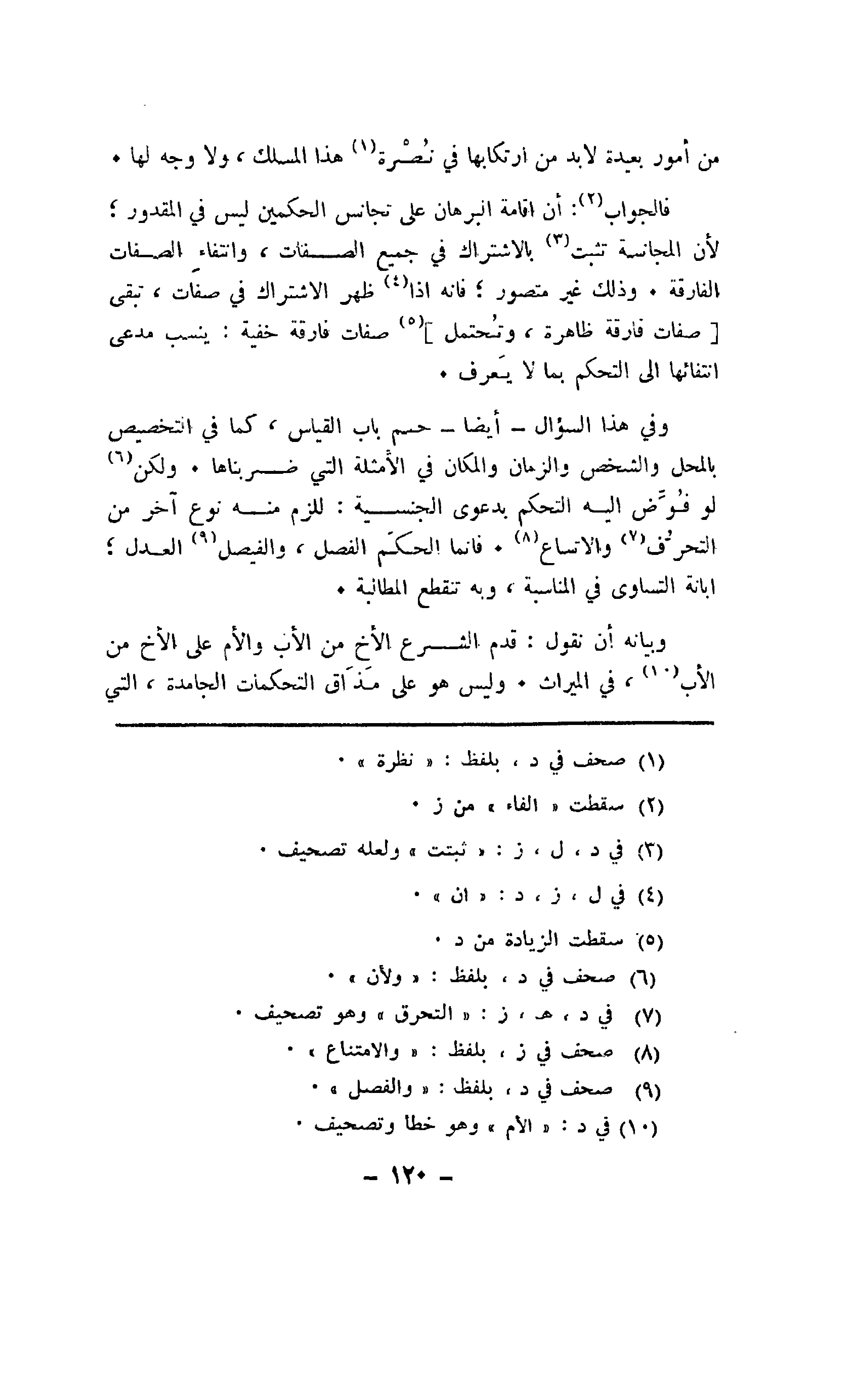 وفي هذا السؤال -أيضاً -حسم باب القياس، كما في التخصيص بالمحل والشخص والزمان والمكان في الأمثلة التي ضربناها. ولكن لو فوض إليه التحكم بدعوى الجنسية: للزم منه نوع آخر من التحرف والاتساع. فإنما الحكم الفصل، والفيصل العدل؛ إبانة التساوي في المناسبة، وبه تنقطع المطالبة.