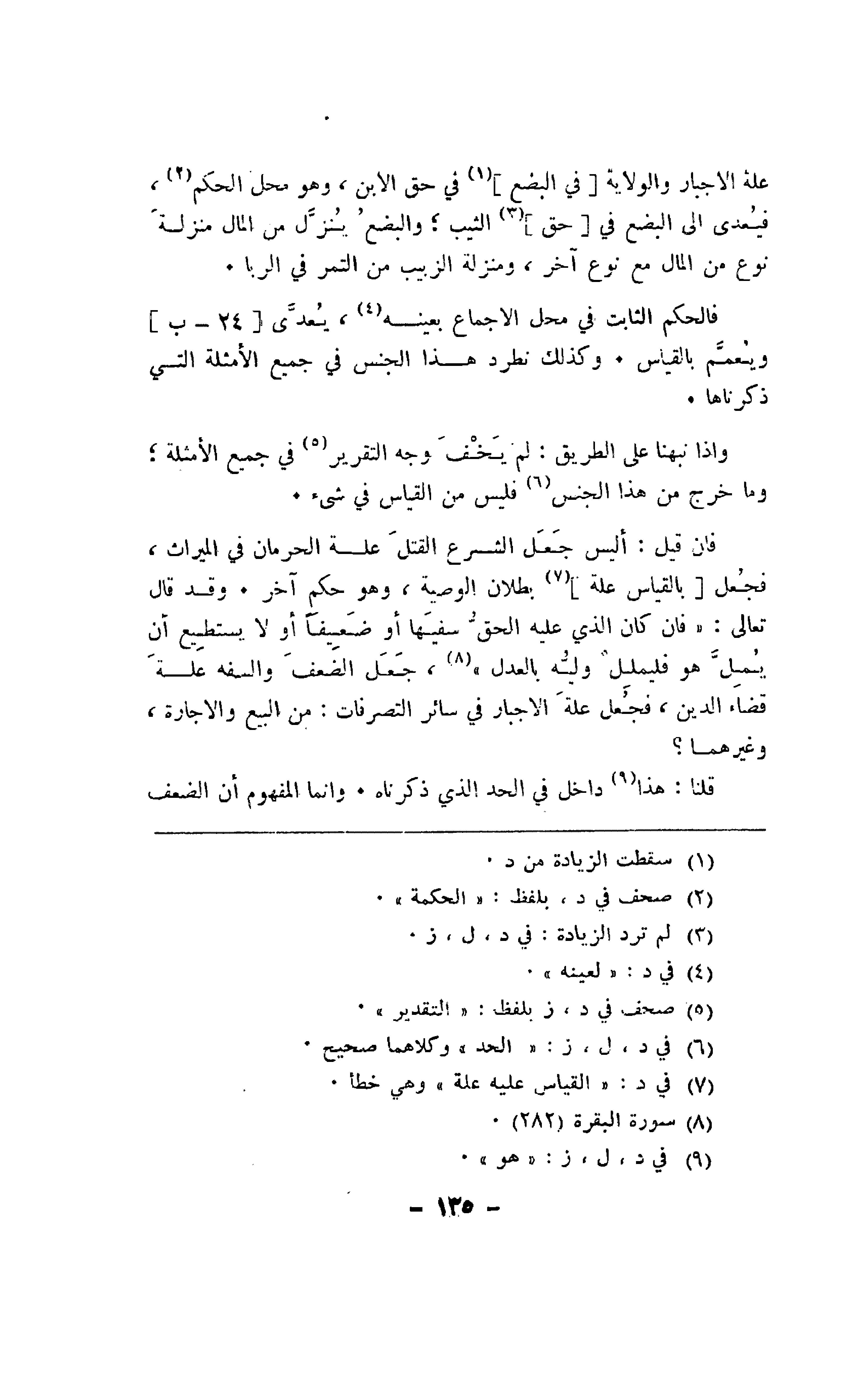 فإن قيل: أليس جعل الشرع القتل علة الحرمان في الميراث، فجعل [بالقياس علة] بطلان الوصية، وهو حكم آخر. وقد قال تعالى: {فإن كان الذي عليه الحق سفيها أو ضعيفا أو لا يستطيع أن يمل هو فليملل وليه بالعدل}، جعل الضعف والسفه علة قضاء الدين، فجعل علة الإجبار في سائر التصرفات: من البيع والإجارة، وغيرهما؟