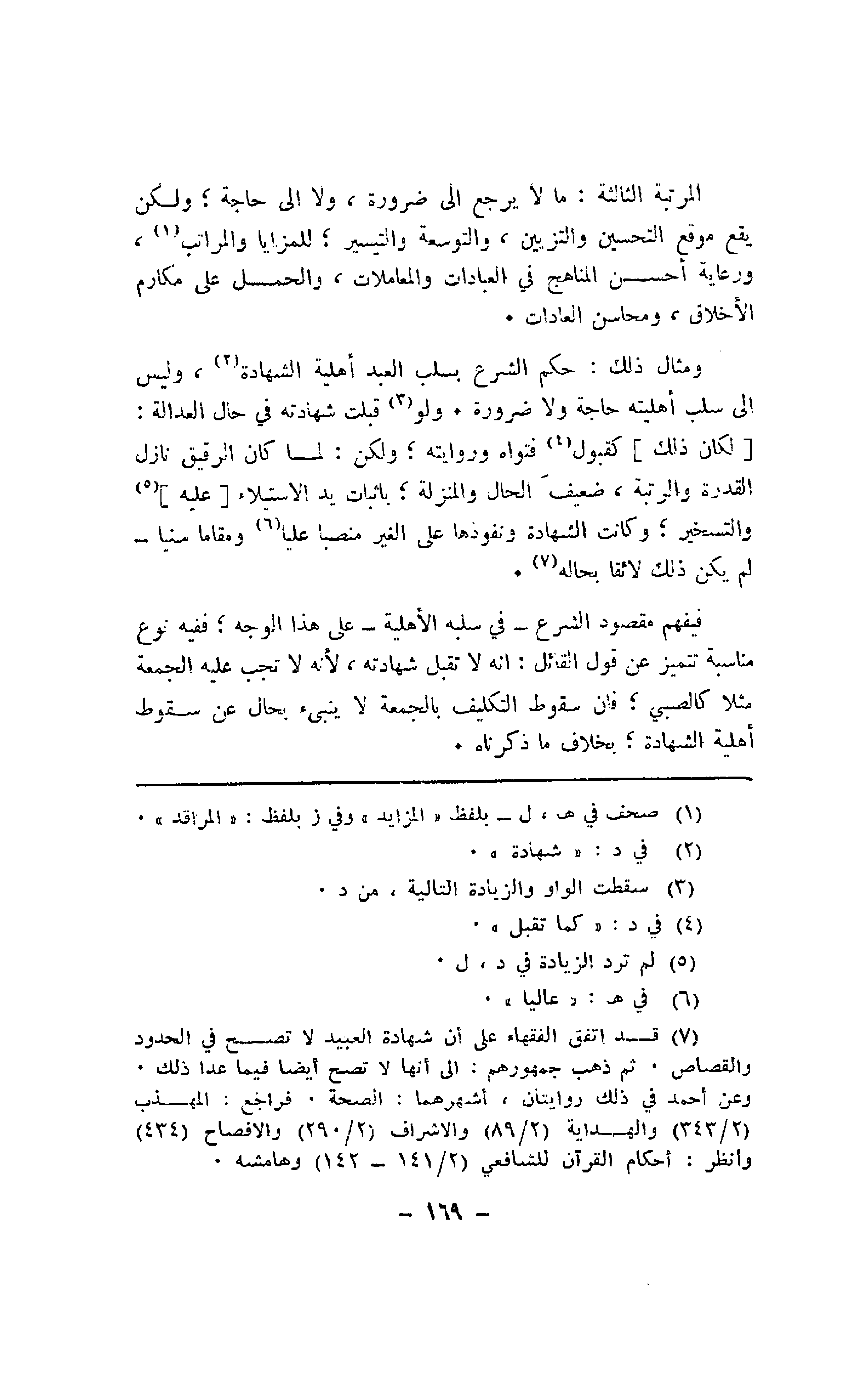 ومثال ذلك: حكم الشرع بسلب العبد أهلية الشهادة، وليس إلى سلب أهليته حاجة ولا ضرورة. ولو قبلت شهادته في حال العدالة: [لكان ذلك] كقبول فتواه وروايته؛ ولكن: لما كان الرقيق نازل القدرة والرتبة، ضعيف الحال والمنزلة؛ بإثبات يد الاستيلاء [عليه] والتسخير؛ وكانت الشهادة ونفوذها على الغير منصبا عليا ومقاما سنيا- لم يكن ذلك لائقا بحاله.