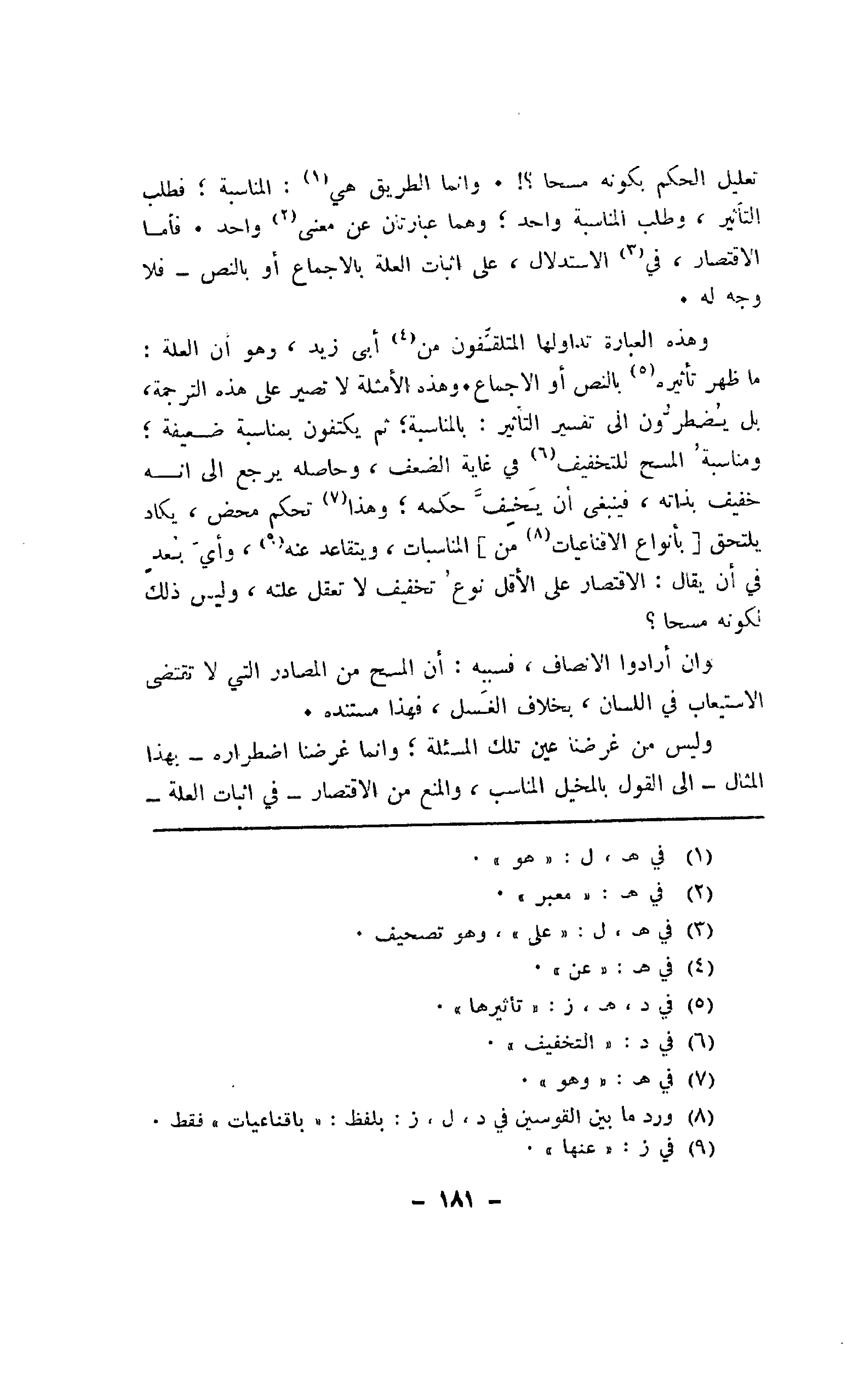 وهذه العبارة تداولها ×× من أبي زيد، وهو أن العلة: ما ظهر تأثيره بالنص أو الإجماع. وهذه الأمثلة لا تصير على هذه الترجمة، بل يضطرون إلى تفسير التأثير: بالمناسبة؛ ثم يكتفون بمناسبة ضعيفة؛ ومناسبة المسح للتخفيف في غاية الضعف، وحاصله يرجع إلى أنه خفيف بذاته، فينبغي أن يخف حكمه؛ وهذا تحكم محض، يكاد يلتحق] بأنواع الاقناعيات من [المناسبات، ويتقاعد عنه، وأي بعد في أن يقال: الاقتصار على الأقل نوع تخفيف لا تعقل علته، وليس ذلك لكونه مسحا؟
