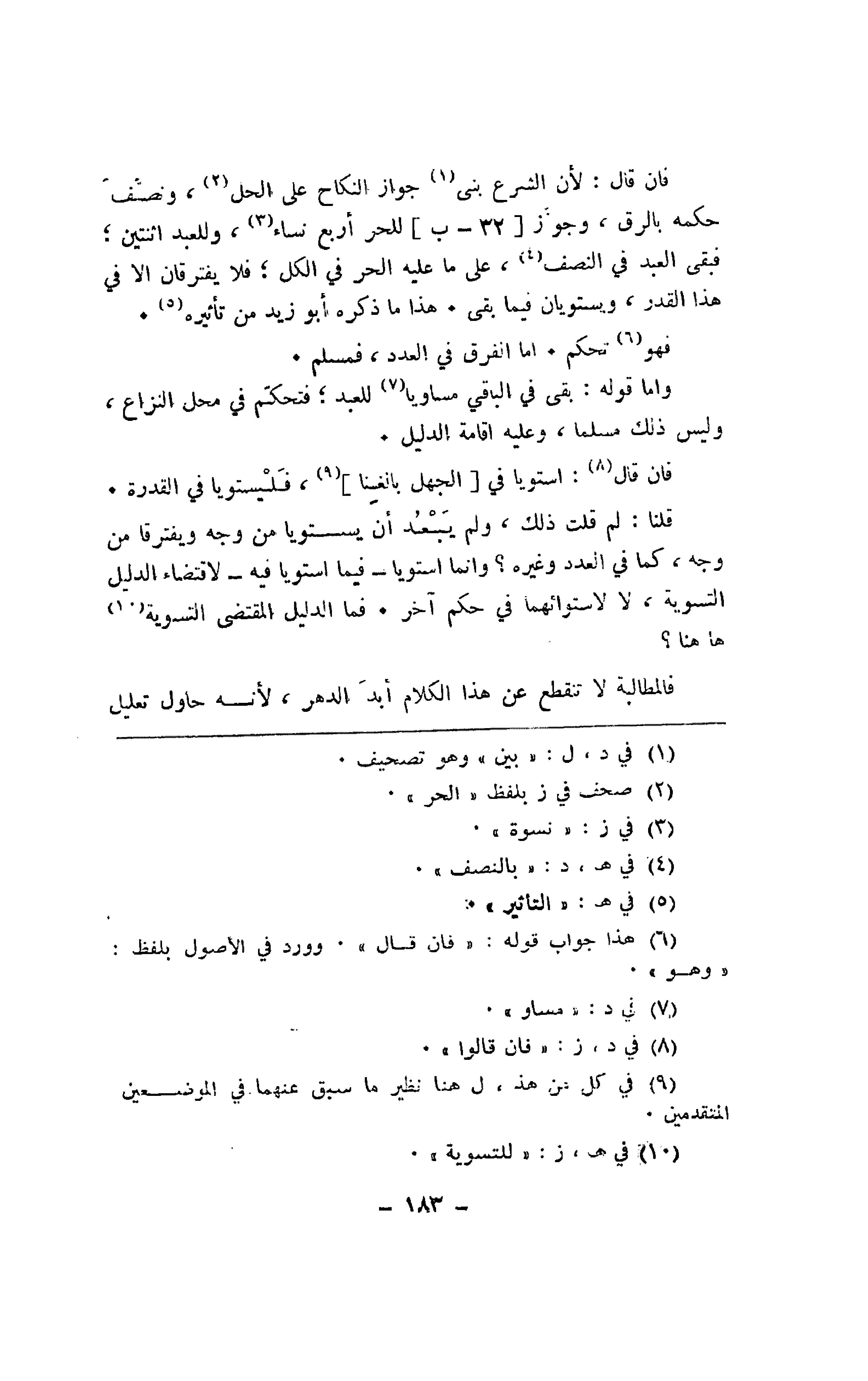 فإن قال: لأن الشرع بني جواز النكاح على الحل، ونصف حكمه بالرق، وجواز] 32 - ب [للحر أربع نساء، وللعبد اثنتين؛ فبقى العبد في النصف، على ما عليه الحر في الكل؛ فلا يفترقان إلا في هذا القدر، ويستويان فيما بقى. هذا ما ذكره أبو زيد من تأثيره.