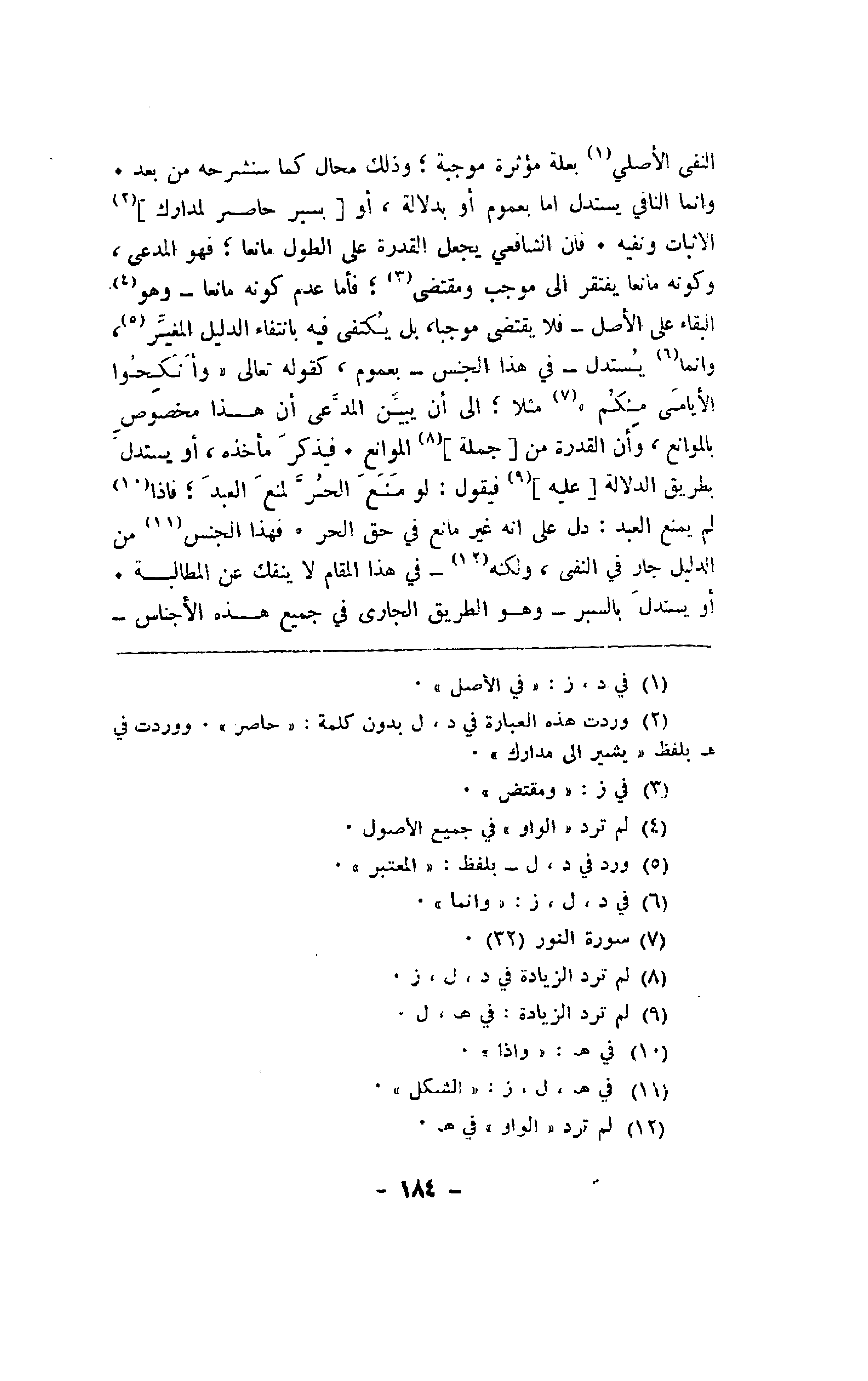 النفي الأصلي بعلة مؤثرة موجبة؛ وذلك محال كما سنشرحه من بعد. وإنما النافي يستدل أما بعموم أو بدلالة، أو] بسير حاصر لمدارك [الإثبات ونفيه. فإن الشافعي يجعل القدرة على الطول مانعاً؛ فهو المدعى، وكونه مانعاً يفتقر إلى موجب ومقتضى؛ فأما عدم كونه مانعا -وهو البقاء على الأصل- فلا يقتضي موجبا، بلا يكتفي فيه بانتفاء الدليل المغير، وإنما يستدل -في هذا الجنس- بعموم، كقوله تعالى "وانكحوا الأيامى منكم" مثلا؛ إلى أن يبين المدعى أن هذا مخصوص بالموانع، وأن القدرة من] جملة [الموانع. فذكر مأخذه، أو يستدل بطريق الدلالة] عليه [فيقول: لو منع الحر. فهذا الجنس من الدليل جار في النفي، ولكنه -في هذا المقام لا ينفك عن المطالبة. أو يستدل ×× -وهو الطريق الجاري في جميع هذه الأجناس-