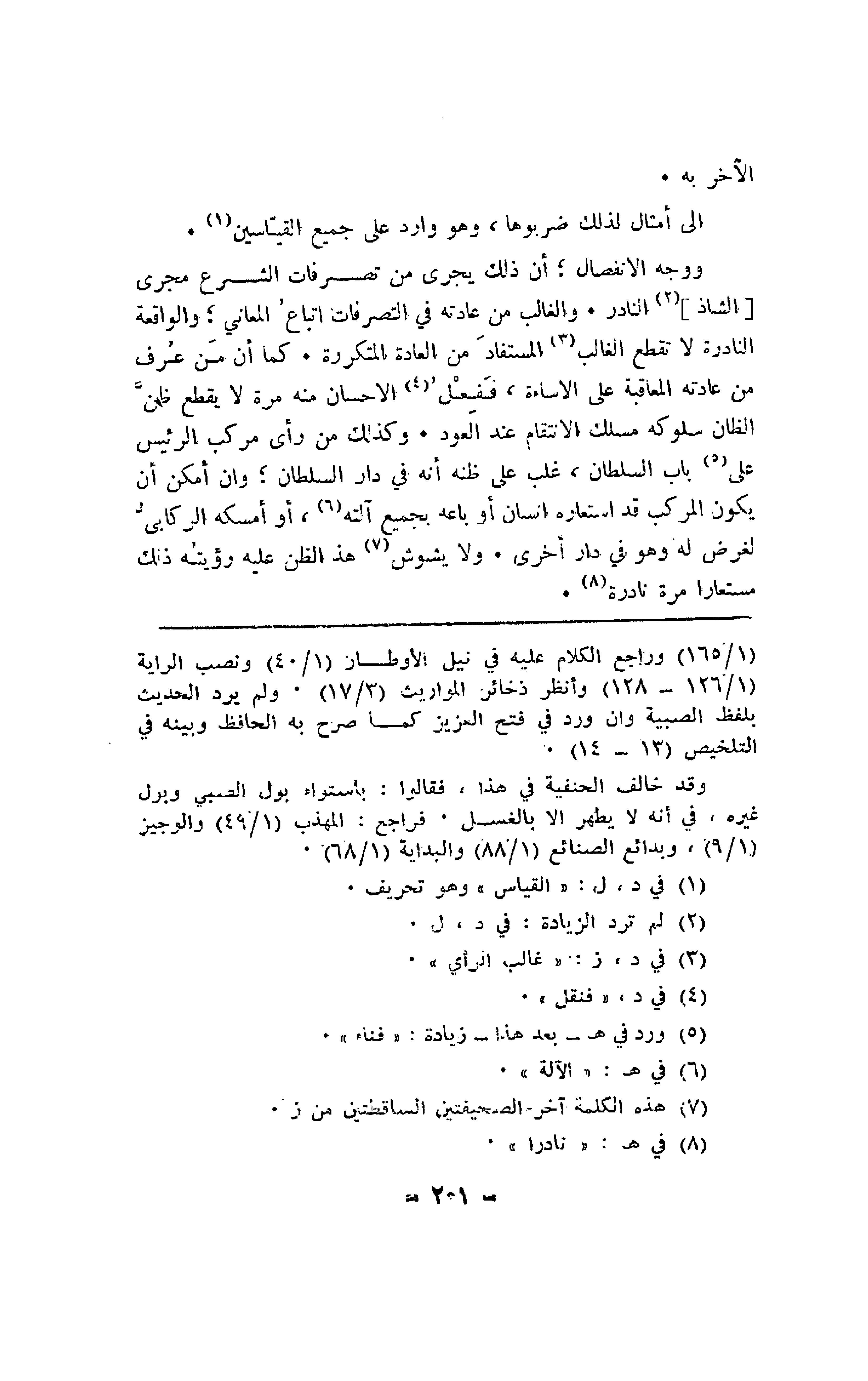 ووجه الانفصال؛ أن ذلك يجري من تصرفات الشرع مجرى [الشاذ] النادر. والغالب من عادته في التصرفات إتباع المعاني؛ والواقعة النادرة لا تقطع الغالب المستفاد من العادة المتكررة. كما أن من عرف من عادته المعاقبة على الإساءة، ففعل الإحسان منه مرة لا يقطع ظن الظان سلوكه مسلك الانتقام عند العود. وكذلك من رأى مركب الرئيس على باب السلطان، غلب على ظنه أنه في دار السلطان؛ وإن أمكن أن يكون المركب قد استعاره إنسان أو باعه بجميع آلته، أو أمسكه الركابي لغرض له وهو في دار أخرى. ولا يشوش هذا الظن عليه رؤيته ذلك مستعاراً مرة نادرة.