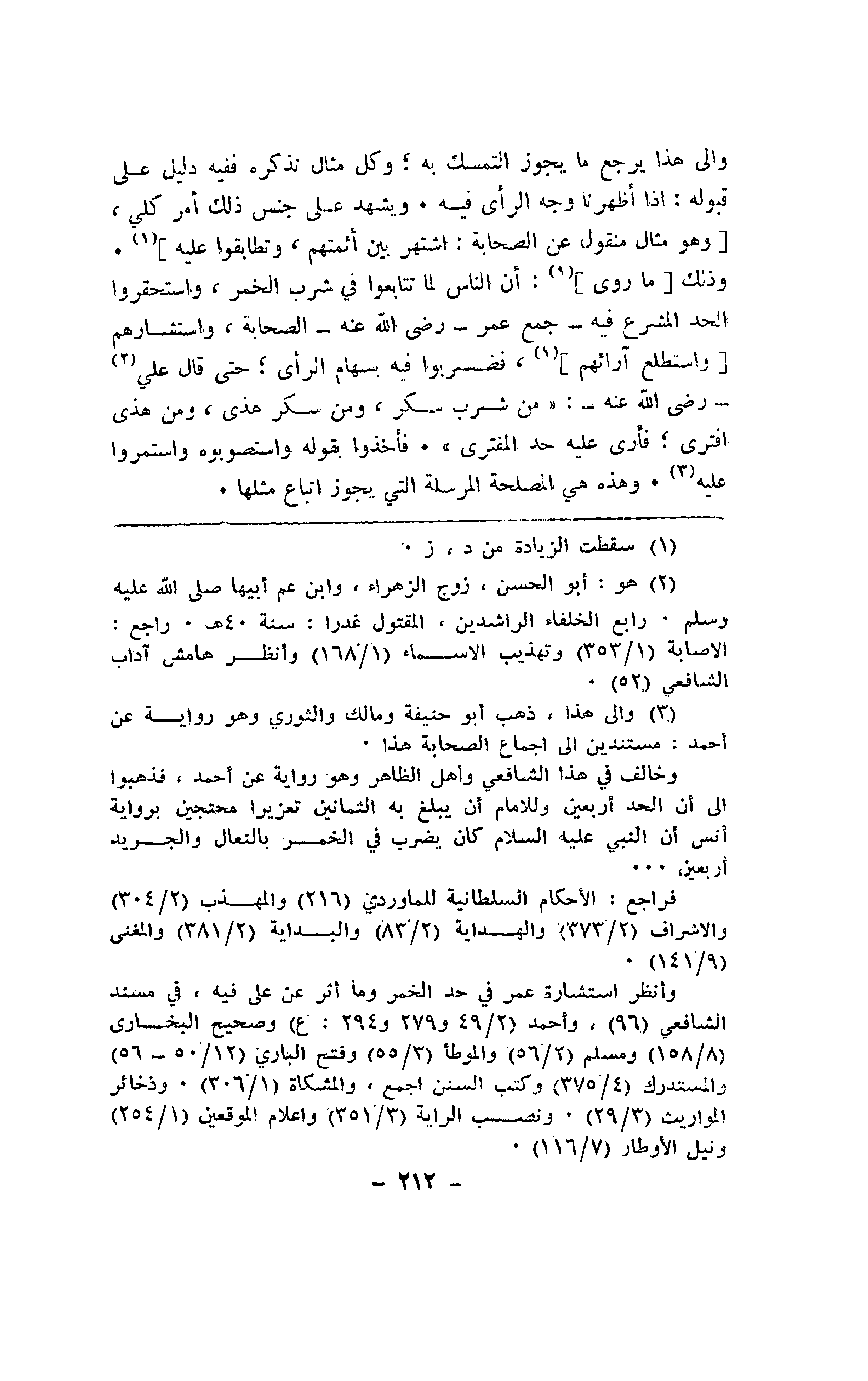 وإلى هذا يرجع ما يجوز التمسك به؛ وكل مثال نذكره ففيه دليل على قبوله: إذا أظهرنا وجه الرأي فيه. ويشهد على جنس ذلك أمر كلي، [وهو مثال منقول عن الصحابة: اشتهر بين أئمتهم، وتطابقوا عليه]. وذلك [ما روى]: أن الناس لما تتابعوا في شرب الخمر، واستحقروا الحد المشرع فيه - جمع عمر - رضي الله عنه - الصحابة، واستشارهم [واستطلع آرائهم]، فضربوا فيه بسهام الرأي؛ حتى قال علي - رضي الله عنه -: "من شرب سكر، ومن سكر هذي، ومن هذى افترى؛ فأرى عليه حد المفترى". فأخذوا بقوله واستصوبوه واستمروا عليه. وهذه هي المصلحة المرسلة التي يجوز اتباع مثلها.