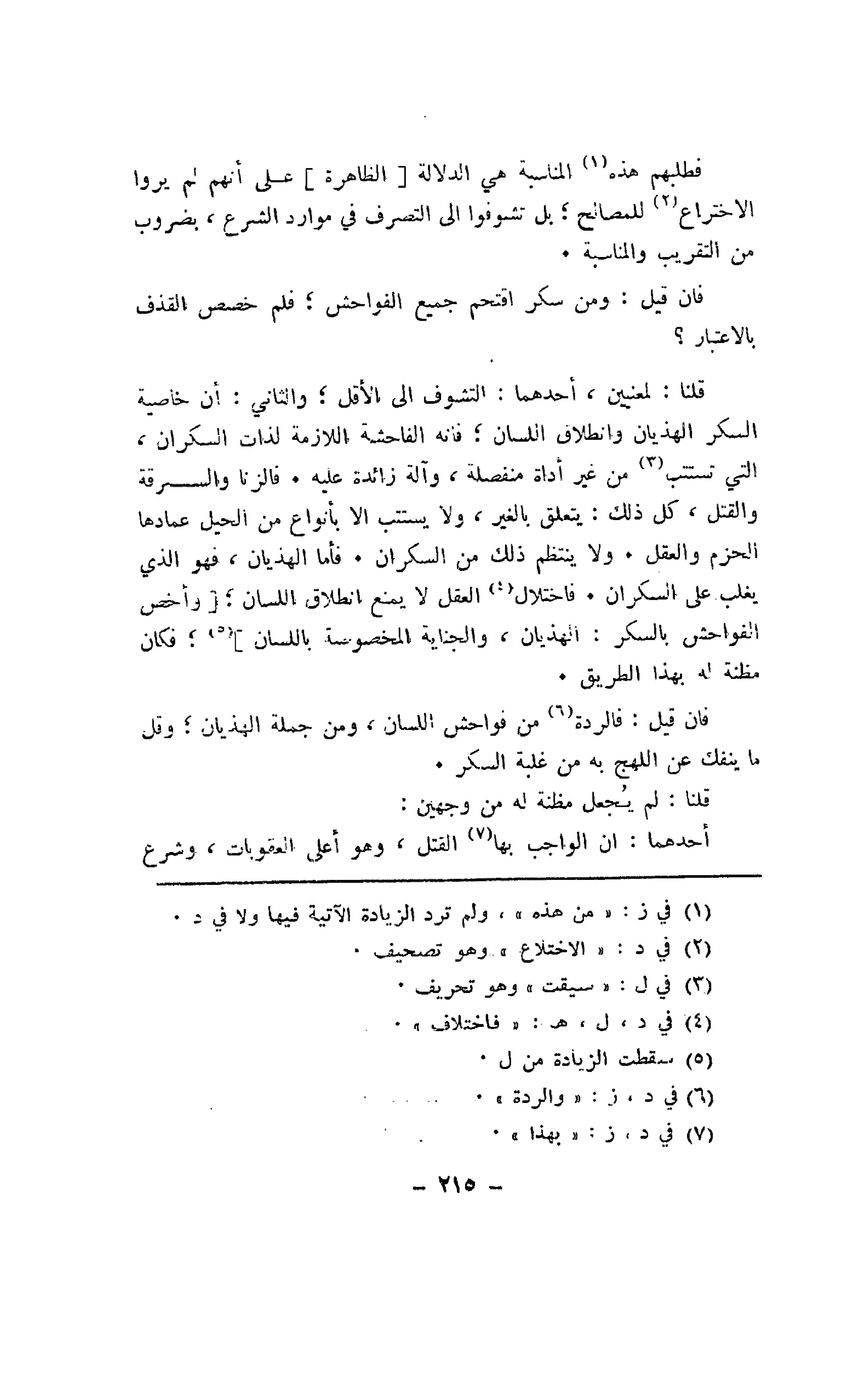 قلنا: لمعنيين، أحدهما: التشوف إلى الأقل؛ والثاني: أن خاصية السكر الهذيان وانطلاق اللسان؛ فإنه الفاحشة اللازمة لذات السكران، التي تستتب من غير أداة منفصلة، وآلة زائدة عليه. فالزنا والسرقة والقتل، كل ذلك: يتعلق بالغير، ولا يستتب إلا بأنواع من الحيل عمادها الحزم والعقل. ولا ينتظم ذلك من السكران. فأما الهذيان، فهو الذي يغلب على السكران. فاختلال العقل لا يمنع انطلاق اللسان؛ [وأخص الفواحش بالسكر: الهذيان، والجناية المخصوصة باللسان]؛ فكان مظنة له بهذا الطريق.