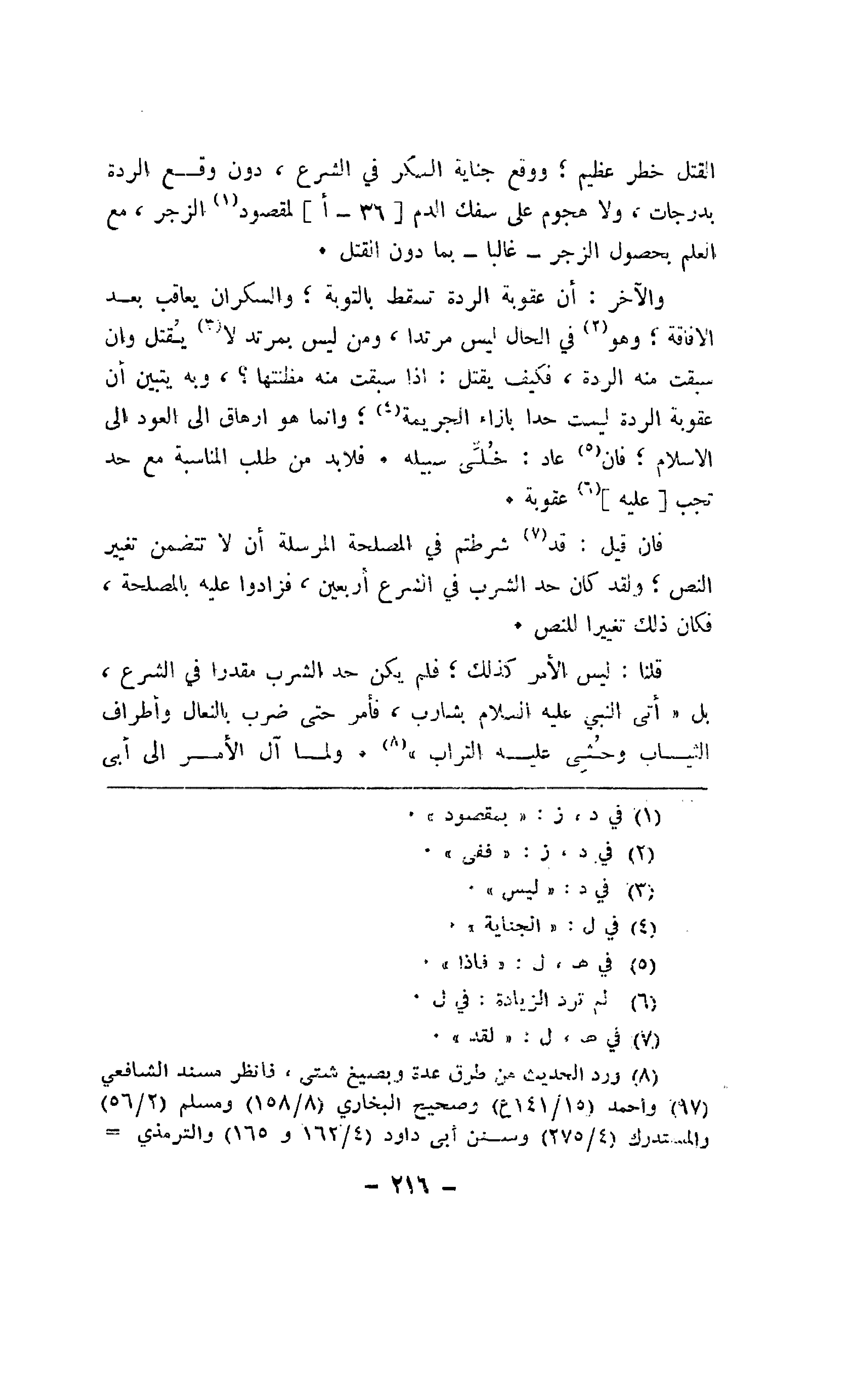 القتل خطر عظيم؛ ووقع جناية السكر في الشرع، دون وقع الردة بدرجات، ولا هجوم على سفك الدم [36 - أ] لمقصود الزجر، مع العلم بحصول الزجر - غالباً - بما دون القتل.