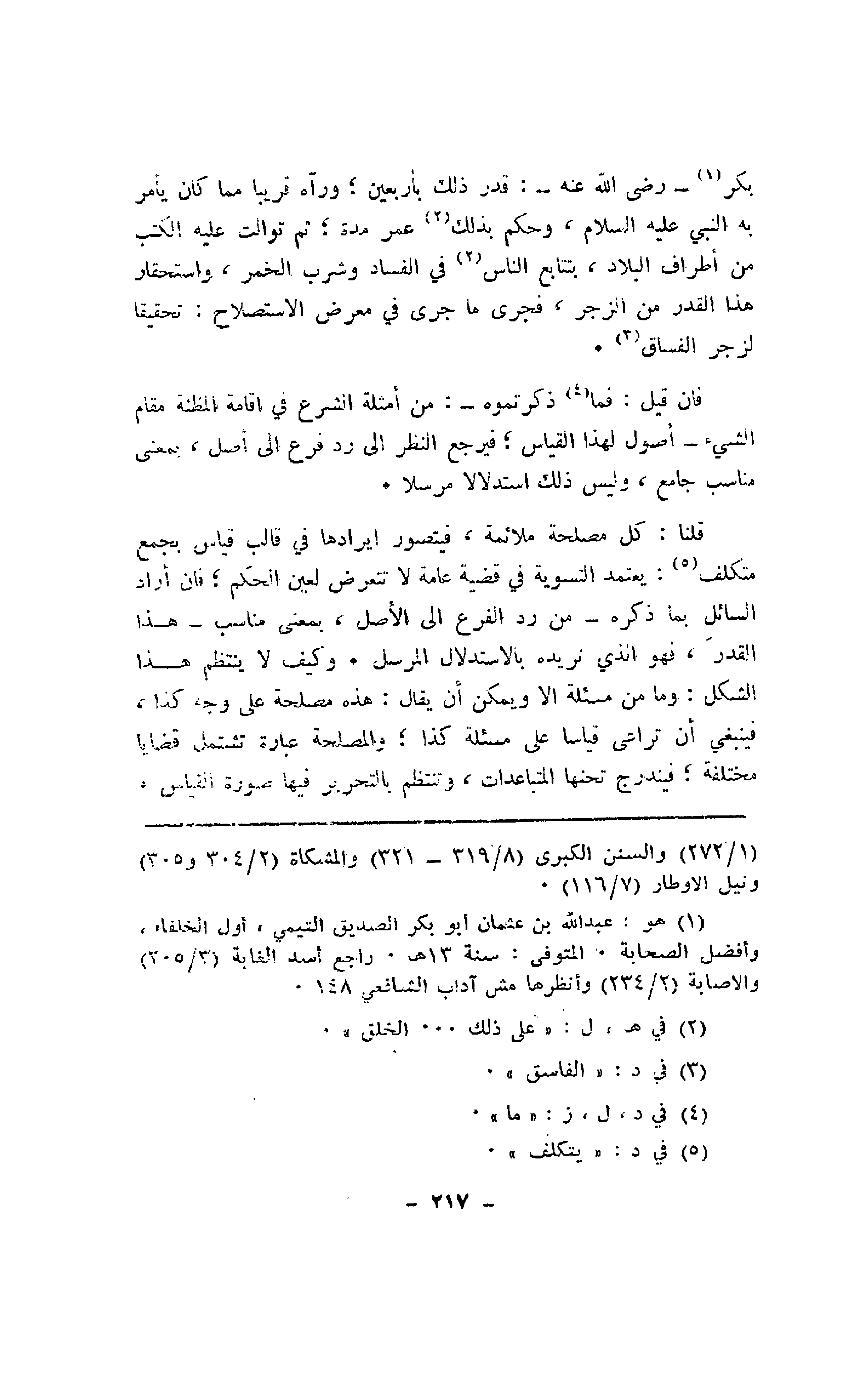 بكر - رضي الله عنه -: قدر ذلك بأربعين؛ ورآه قريبا مما كان يأمر به النبي - عليه السلام -، وحكم بذلك عمر مدة؛ ثم توالت عليه الكتب من أطراف البلاد، بتتابع الناس في الفساد وشرب الخمر، واستحقار هذا القدر من الزجر، فجرى ما جرى في معرض الاستصلاح: تحقيقا لزجر الفساق.