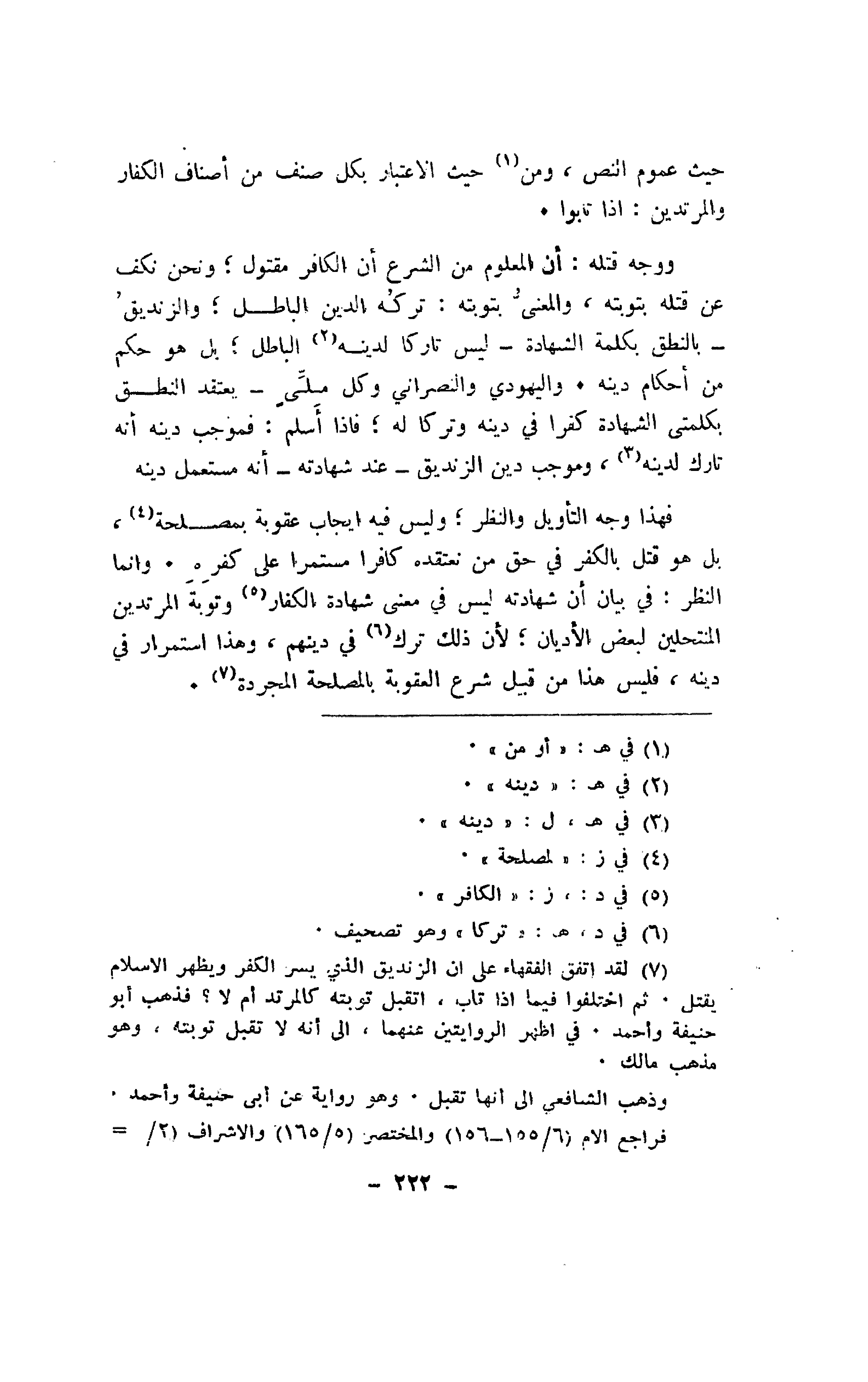 ووجه قتله: أن المعلوم من الشرع أن الكافر مقتول؛ ونحن نكف عن قتله بتوبته، والمعنى بتوبته: تركه الدين الباطل؛ والزنديق - بالنطق بكلمة الشهادة - ليس تاركا لدينه الباطل؛ بل هو حكم من أحكام دينه. واليهودي والنصراني وكل ملى - يعتقد النطق بكلمتي الشهادة كفراً في دينه وتركا له؛ فإذا أسلم: فموجب دينه أنه تارك لدينه، وموجب دين الزنديق - عند شهادته - أنه مستعمل دينه.
