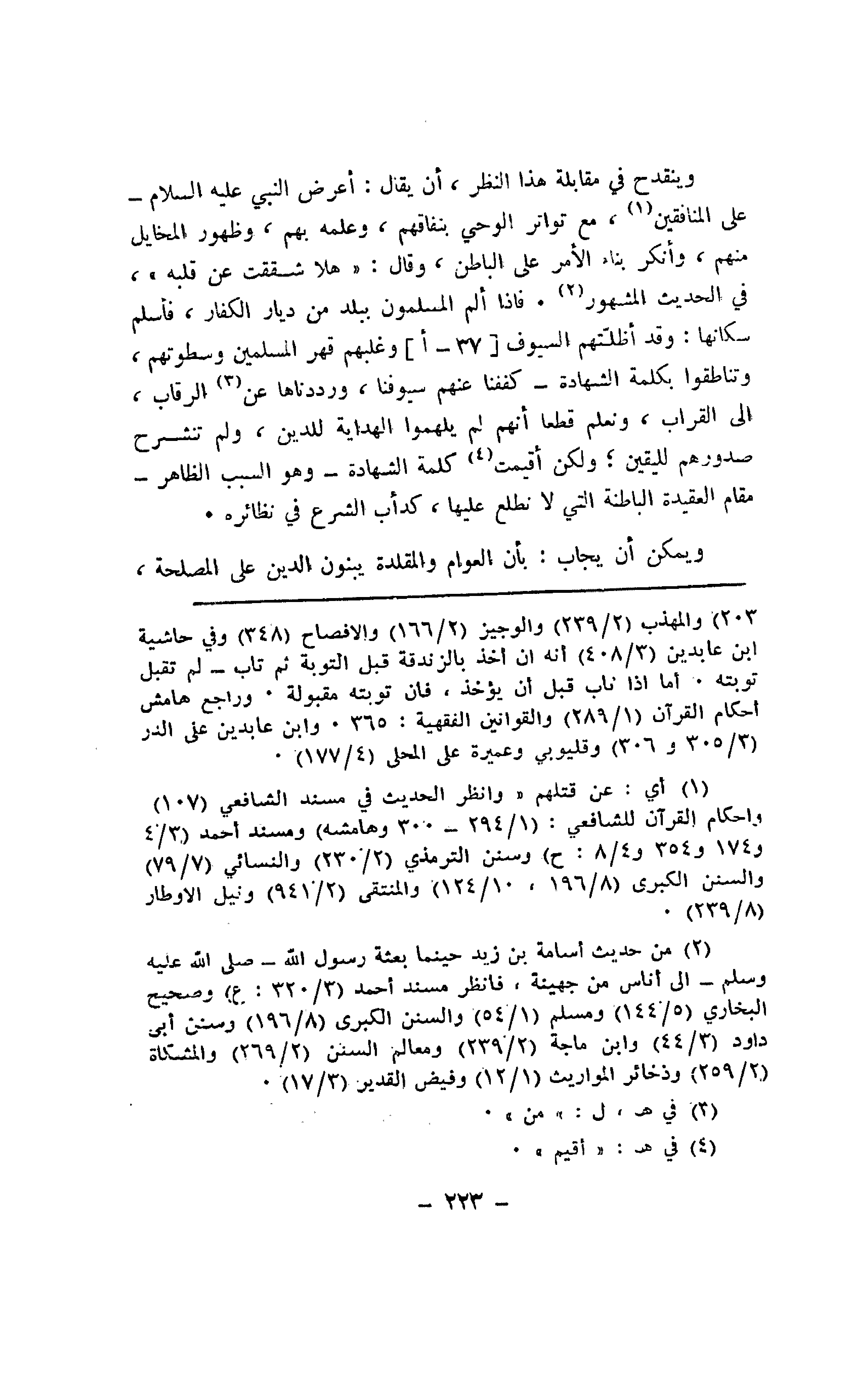 وينقدح في مقابلة هذا النظر، أن يقال: أعرض النبي عليه السلام - على المنافقين، مع تواتر الوحي بنفاقهم، وعلمهم بهم، وظهور المخايل منهم، وأنكر بناء الأمر على الباطن، وقال: "هلا شققت عن قلبه"، في الحديث المشهور. فإذا ألم المسلمون ببلد من ديار الكفار، فأسلم سكانها: وقد أظلّتهم السيوف [37 - أ] وغلبهم قهر المسلمين وسطوتهم، وتناطقوا بكلمة الشهادة - كففنا عنهم سيوفنا، ورددناها عن الرقاب، إلى القراب، ونعلم قطعا أنهم لم يلهموا الهداية للدين، ولم تنشرح صدورهم لليقين؛ ولكن أقيمت كلمة الشهادة - وهو السبب الظاهر - مقام العقيدة الباطنة التي لا نطلع عليها، كدأب الشرع في نظائره.
