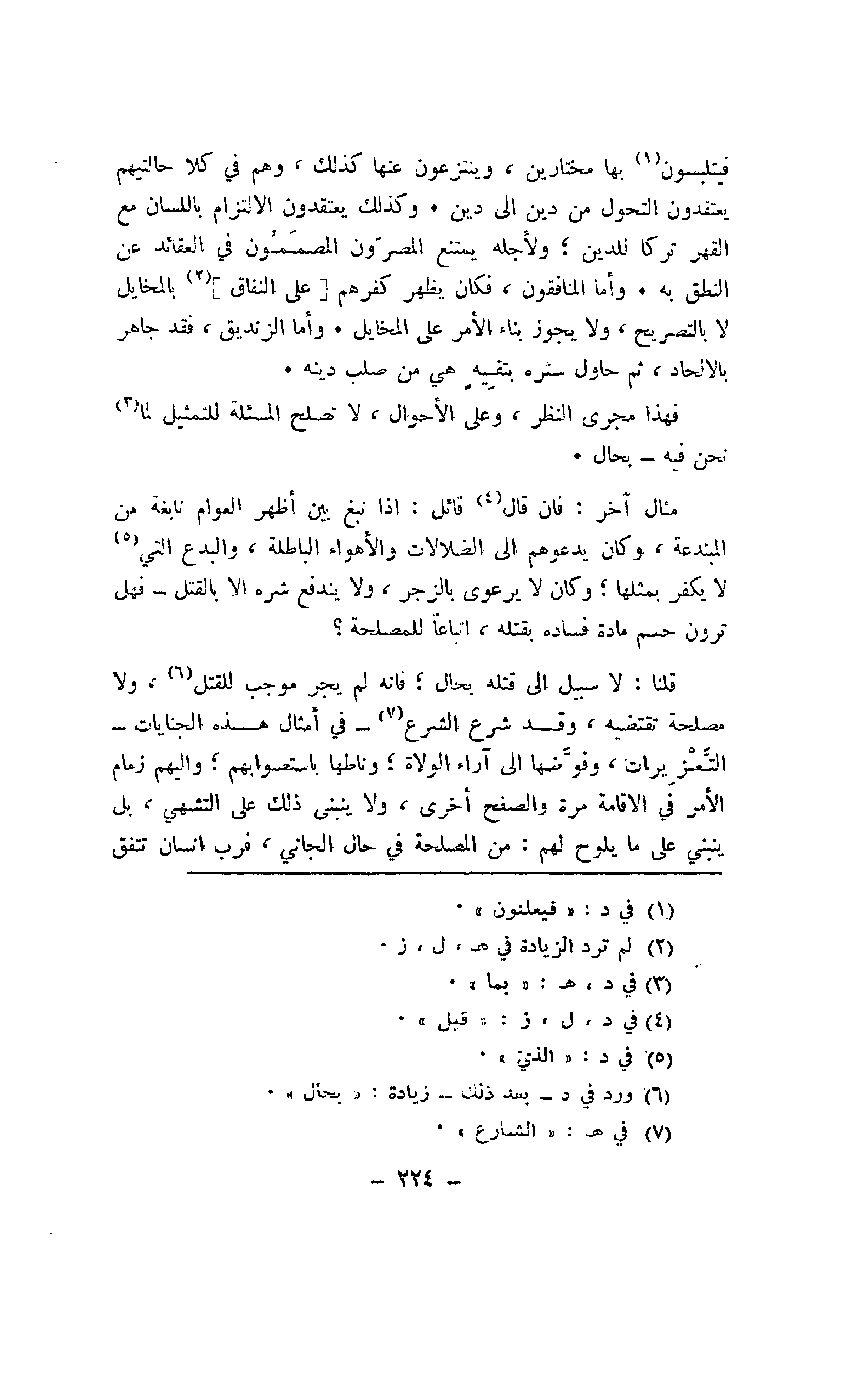 فيتلبسون بها مختارين، وينتزعون عنها كذلك، وهم في كلا حالتيهم يعتقدون التحول من دين إلى دين. وكذلك يعتقدون الالتزام باللسان مع القهر تركا للدين؛ ولأجله يمتنع المصرّون المصمّمُون في العقائد عن النطق به. وأما المنافقون، فكان يظهر كفرهم [على النفاق] بالمخايل لا بالتصريح، ولا يجوز بناء الأمر على المخايل. وأما الزنديق، فقد جاهر بالالحاد، ثم حاول ستره بتقيه هي من صلب دينه.