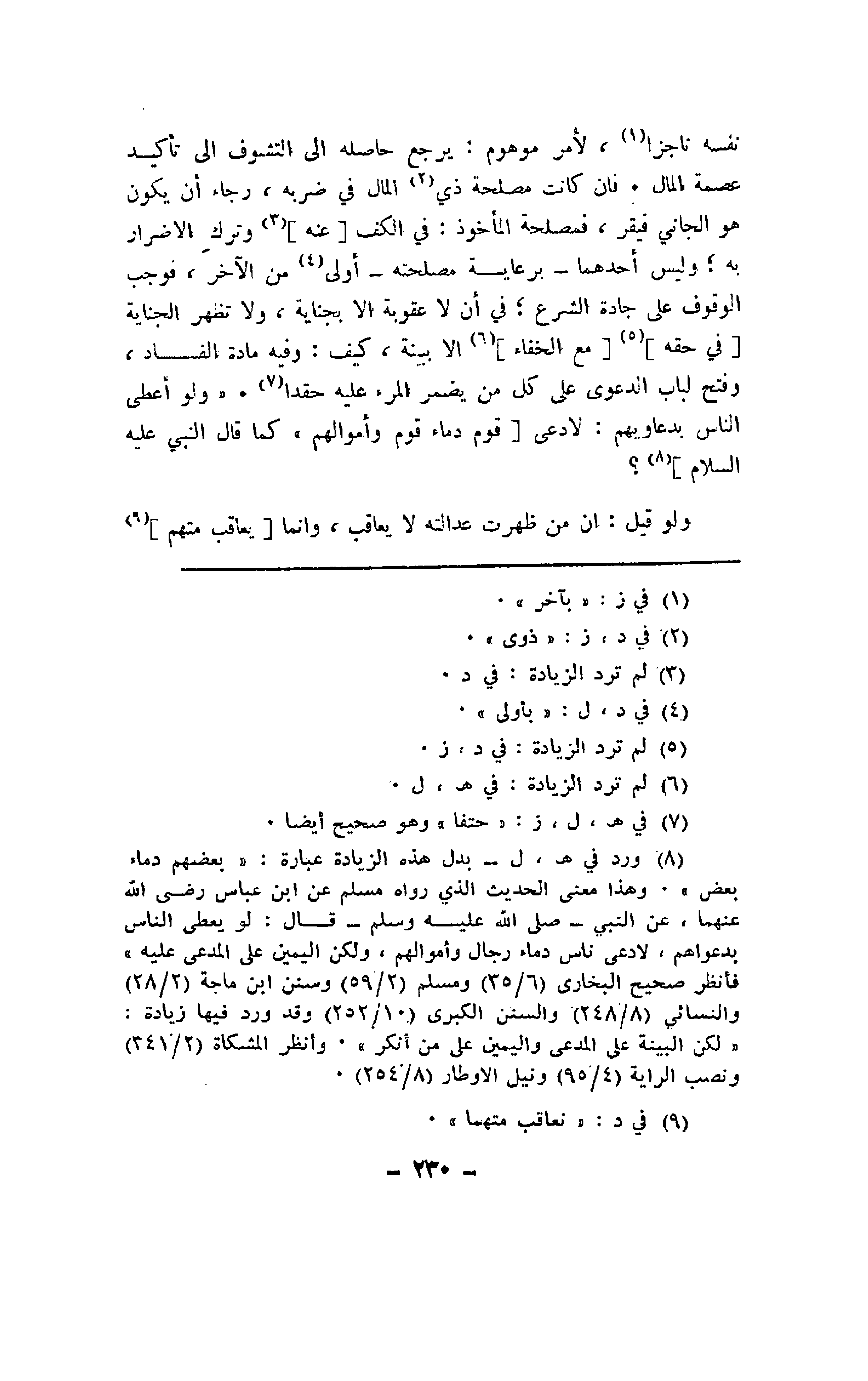 نفسه ناجزا، لأمر موهوم: يرجع حاصله إلى التشوف إلى تأكيد عصمة المال. فإن كانت مصلحة ذي المال في ضربه، رجاء أن يكون هو الجاني فيقر، فمصلحة المأخوذ: في الكف [عنه] وترك الأضرار به؛ وليس أحدهما - برعاية مصلحته - أولى من الآخر، فوجب الوقوف على جادة الشرع؛ في أن لا عقوبة إلا بجناية، ولا تظهر الجناية [في حقه] [مع الخفاء] إلا ببينة، كيف: وفيه مادة الفساد، وفتح لباب الدعوى على كل من يضمر المرء عليه حقدا. "ولو أعطى الناس بدعاويهم: لا دعى [قوم دماء قوم وأموالهم" كما قال النبي عليه السلام]؟