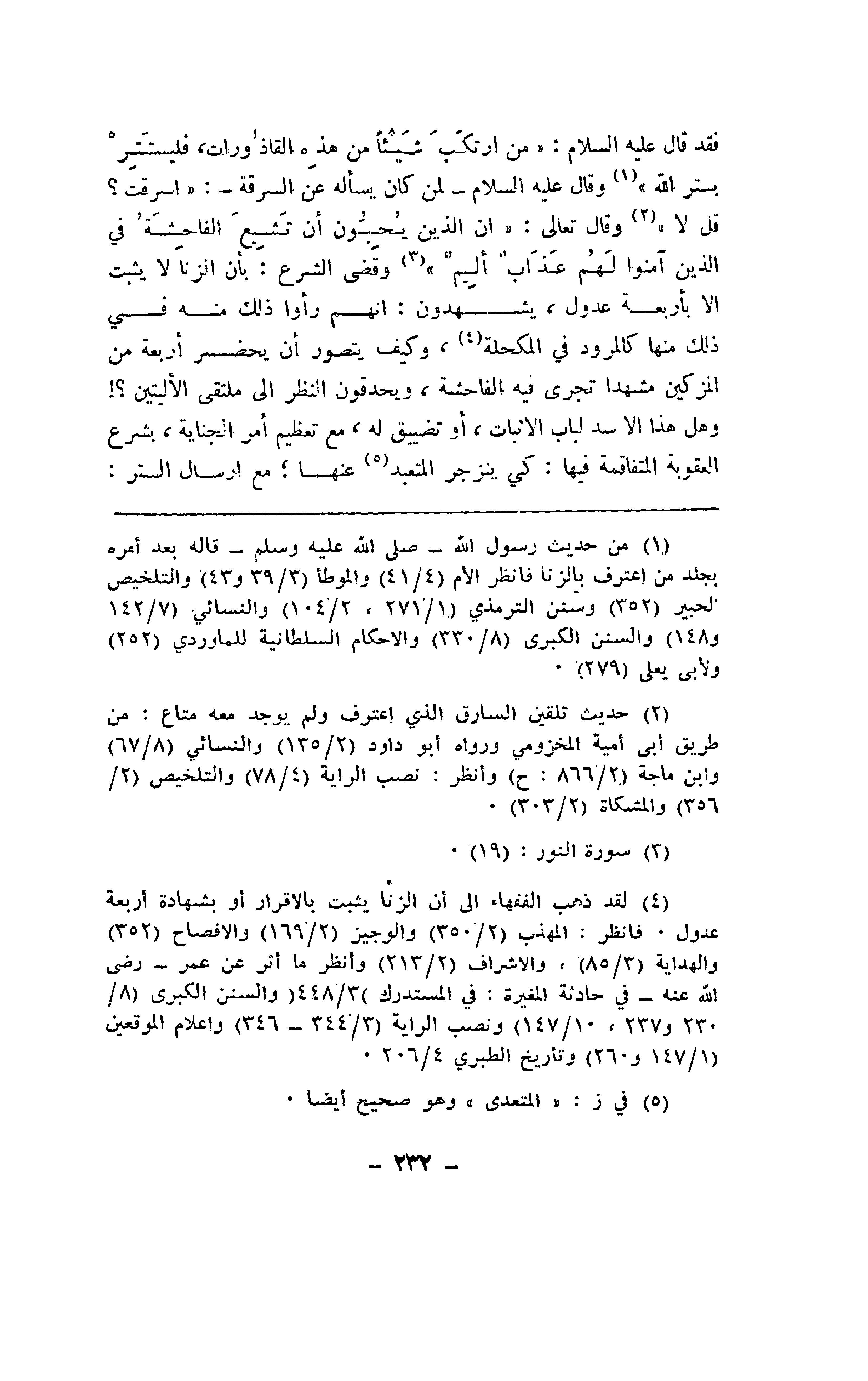 فقد قال عليه السلام: "من ارتكب شيئًا من هذه القاذورات، فليستتر بستر الله" وقال عليه السلام - لمن كان يسأله عن السرقة -: "أسرقت؟ قال لا" وقال تعالى: {إن الذين يحبونا، تشيع الفاحشة في الذين آمنوا لهم عذاب أليم} وقضي الشرع: بأن الزنا لا يثبت إلا بأربعة عدول، يشهدون: أنهم رأوا ك منه ي ك منها كالمرود في المكحلة، وكيف يتصور أن يحضر أربعة من المزكين مشهدا تجري فيه الفاحشة، ويحدقون النظر إلى ملتقى الأليتين؟! وهل هذا الأسد لباب الإثبات، أو تضييق له، مع تعظيم أمر الجناية، بشرع العقوبة المتفاقمة فيها: كي ينزجر المتعبد عنها؛ مع إرسال الستر: