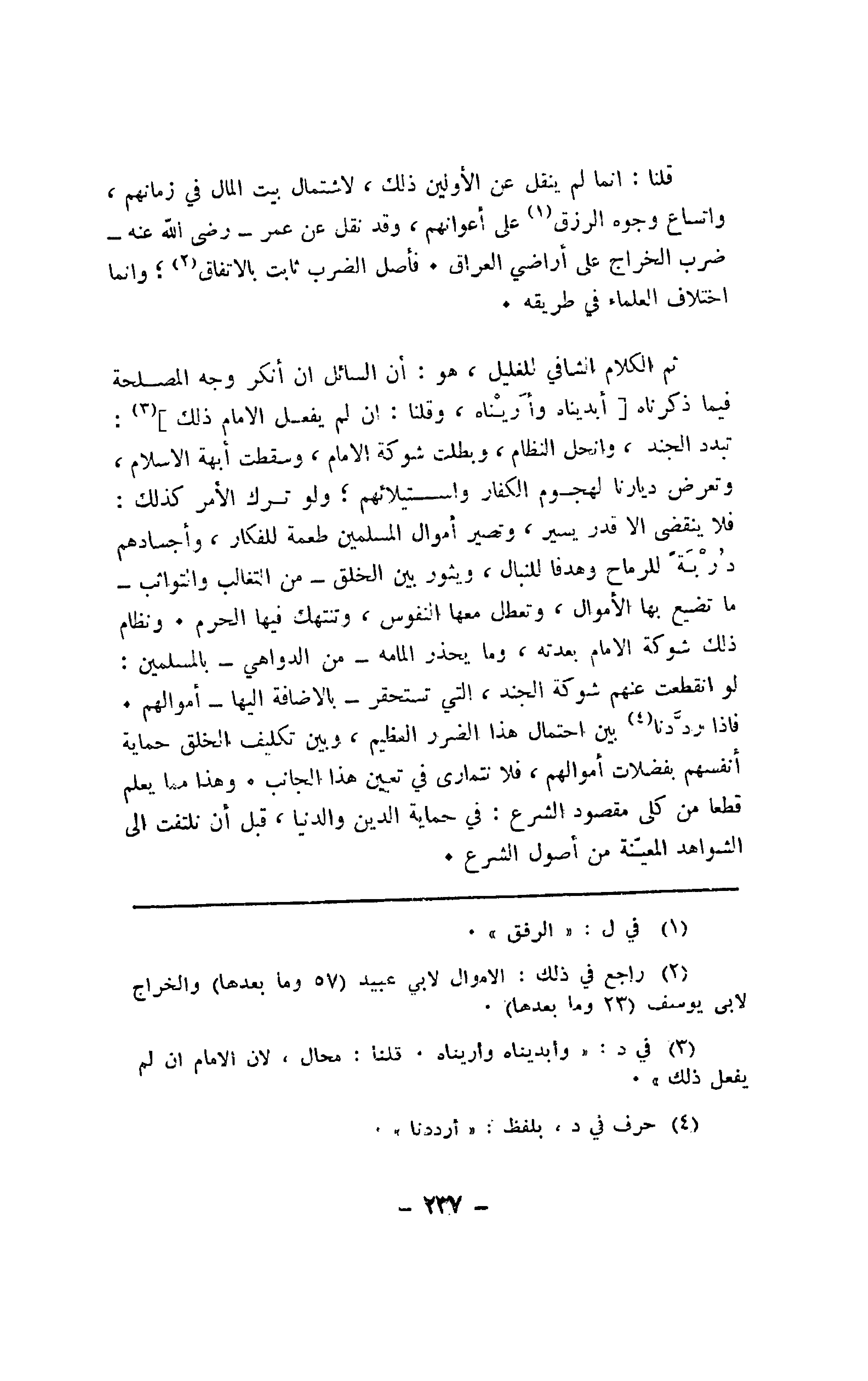 قلنا: إنما لم ينقل عن الأولين ذلك، لاشتمال بيت المال في زمانهم، واتساع وجوه الرزق على أعوانهم، وقد نقل عن عمر - رضي الله عنه - ضرب الخراج على أراضي العراق. فأصل الضرب ثابت بالاتفاق؛ وإنما اختلاف العلماء في طريقه.