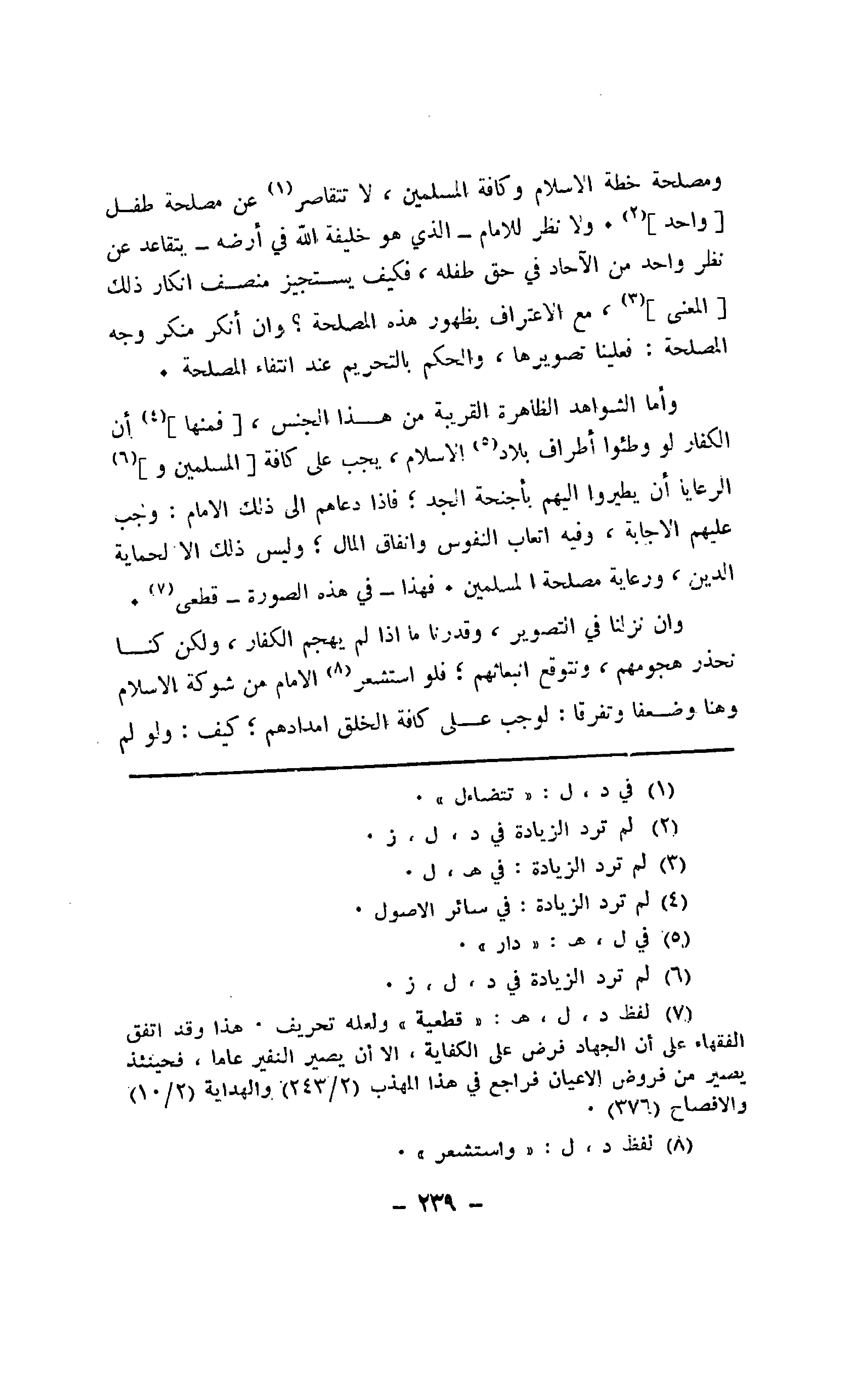 وأما الشواهد الظاهرة القريبة من هذا الجنس، [فمنها] أن الكفار لو وطئوا أطراف بلاد الإسلام، يجب على كافة [المسلمين و] الرعايا أن يطيروا إليهم بأجنحة الجد؛ فإذا دعاهم إلى ذلك الإمام: وجب عليهم الإجابة، وفيه أتعاب النفوس وأنفاق المال؛ وليس ذلك إلا لحماية الدين، ورعاية مصلحة المسلمين. فهذا - في هذه الصورة - قطعى.