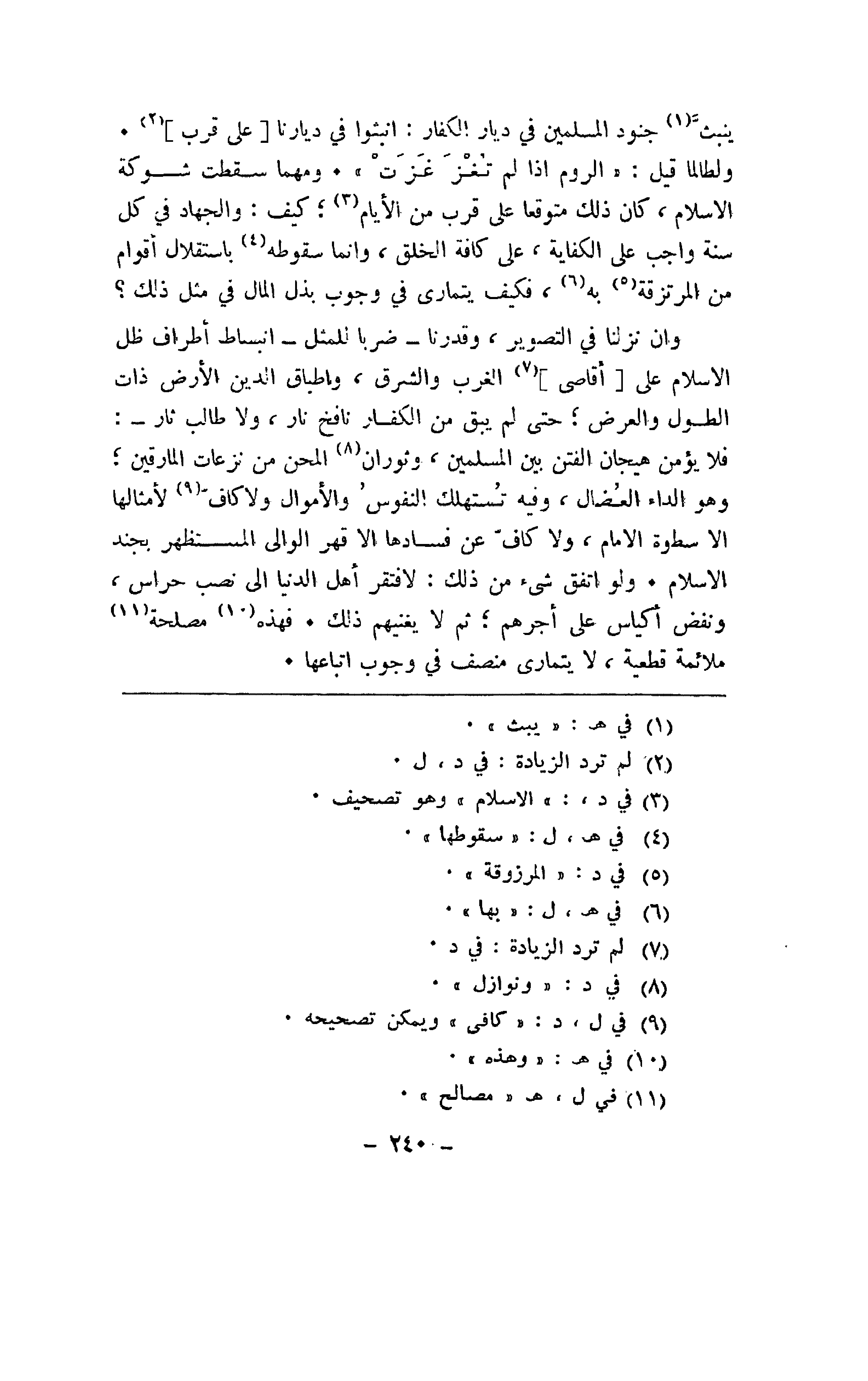 ينبث جنود المسلمين في ديار الكفار: انبتوا في ديارنا [على قرب]. ولطالما قيل: "الروم إذا لم تغز غزت". ومهما سقطت شوكة الإسلام، كان ك متوقعا على قرب من الأيام؛ كيف: والجهاد في كل سنة واجب على الكفاية، على كافة الخلق، وإنما سقوطه باستقلال أقوام من المرتزقة به، فكيف يتمارى في وجوب بذل المال في مثل ذلك؟