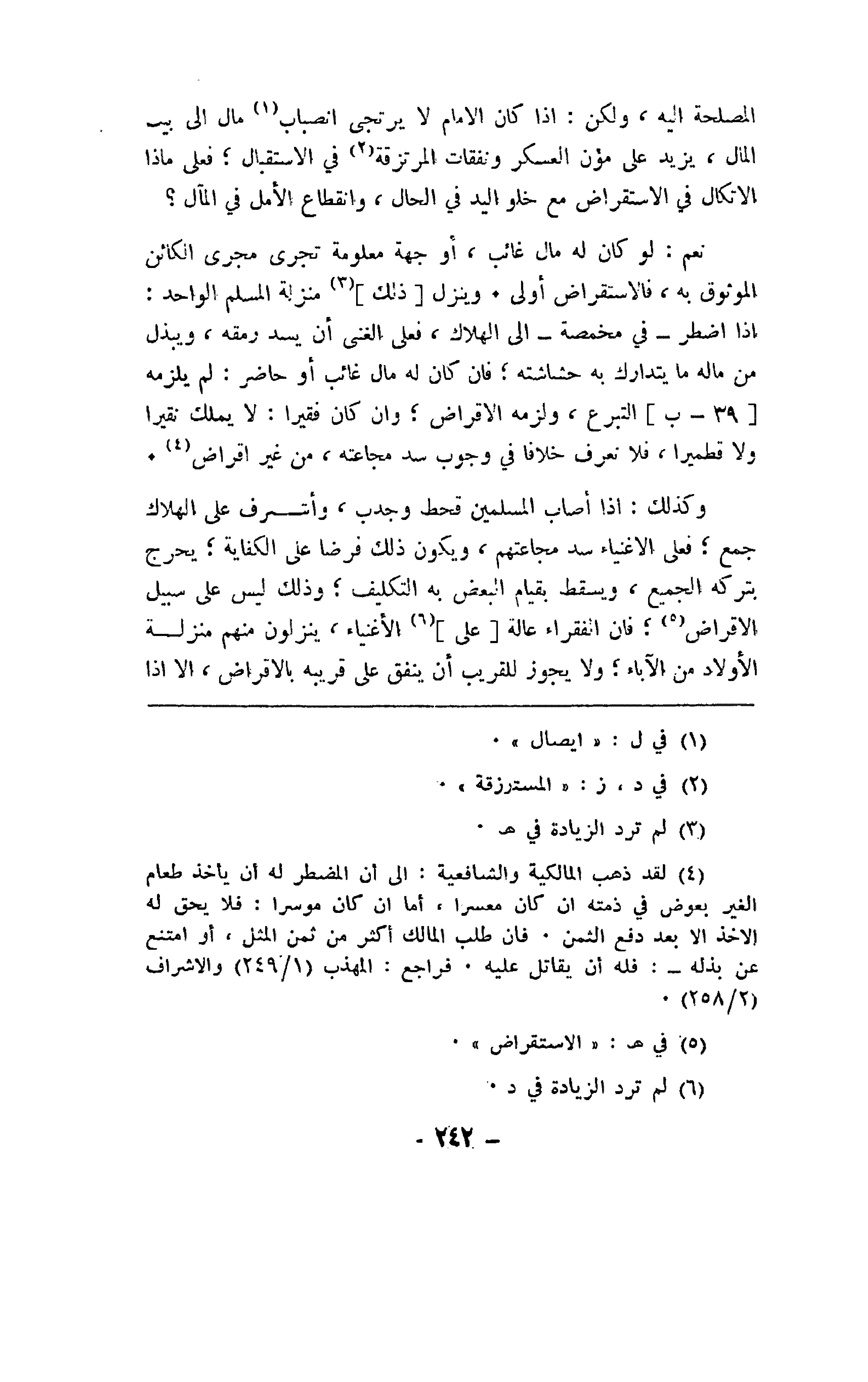 نعم: لو كان له مال غائب، أو جهة معلومة تجري مجرى الكائن الموثوق به، فالاستقراض أولى. وينزل [ذلك] منزلة المسلم الواحد: إذا اضطر - في مخمصة - إلى الهلاك، فعلى الغنى أن يسد رمقه، ويبذل من ماله ما يتدارك به حشاشته؛ فإن كان له مال غائب أو حاضر: لم يلزمه [39 - ب] التبرع، ولزمه الإقراض؛ وإن كان فقيرا: لا يملك نقيرا ولا قطميرا، فلا نعرف خلافا في وجوب سد مجاعته، من غير إقراض.