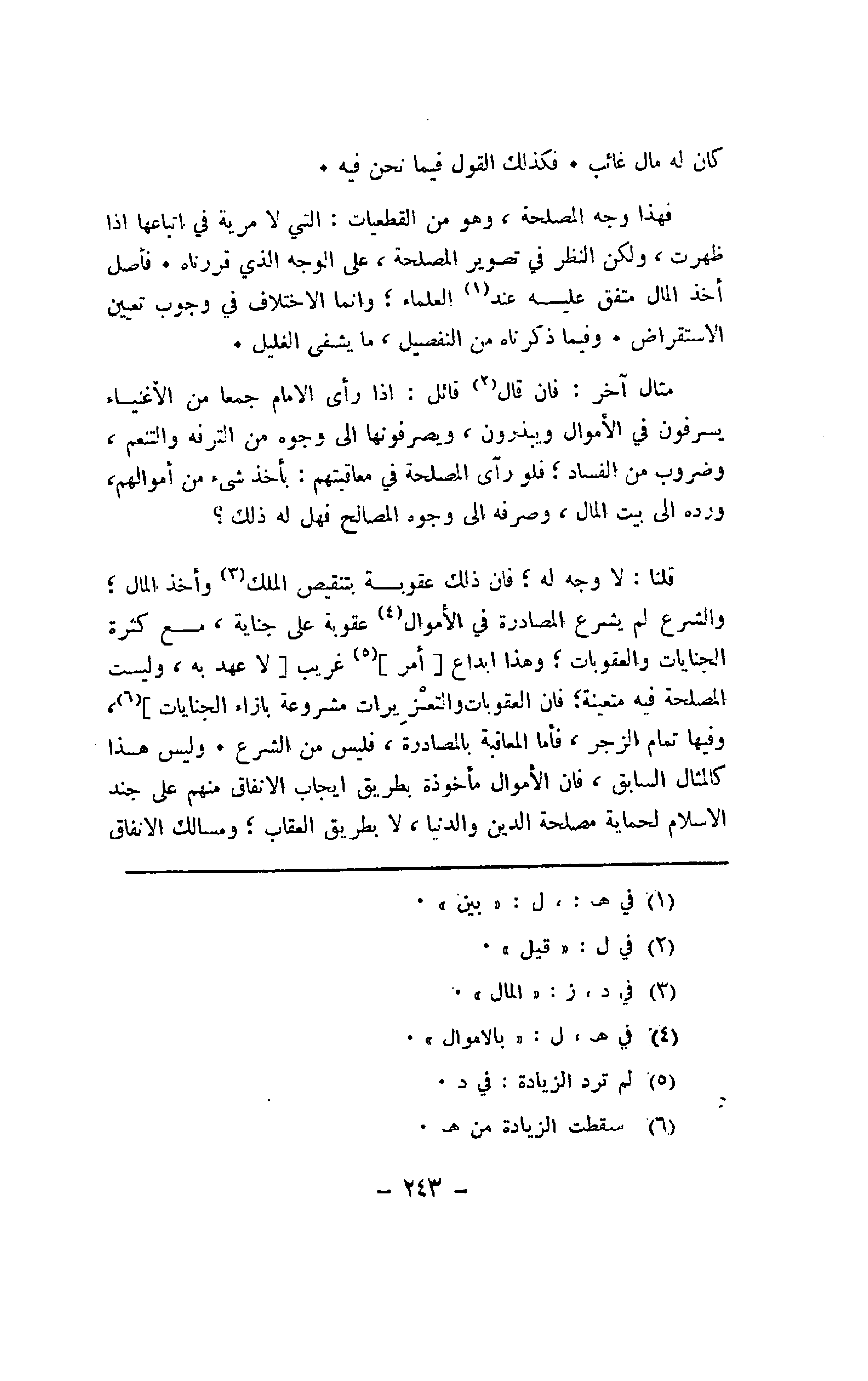 قلنا: لا وجه له؛ فإن ذلك عقوبة بتنقيص الملك وأخذ المال؛ والشرع لم يشرع المصادرة في الأموال عقوبة على جناية، مع كثرة الجنايات والعقوبات؛ وهذا ابداع [أمر] غريب [لا عهد به، وليست المصلحة فيه متعينة؛ فإن العقوبات والتعزيرات مشروعة بإزاء الجنايات]، وفيها تمام الزجر، فأما المعاقبة بالمصادرة، فليس من الشرع. وليس هذا كالمثال السابق، فإن الأموال مأخوذة بطريق ايجاب الانفاق منهم على جند الإسلام لحماية مصلحة الدين والدنيا، لا بطريق العقاب؛ ومسالك الإنفاق