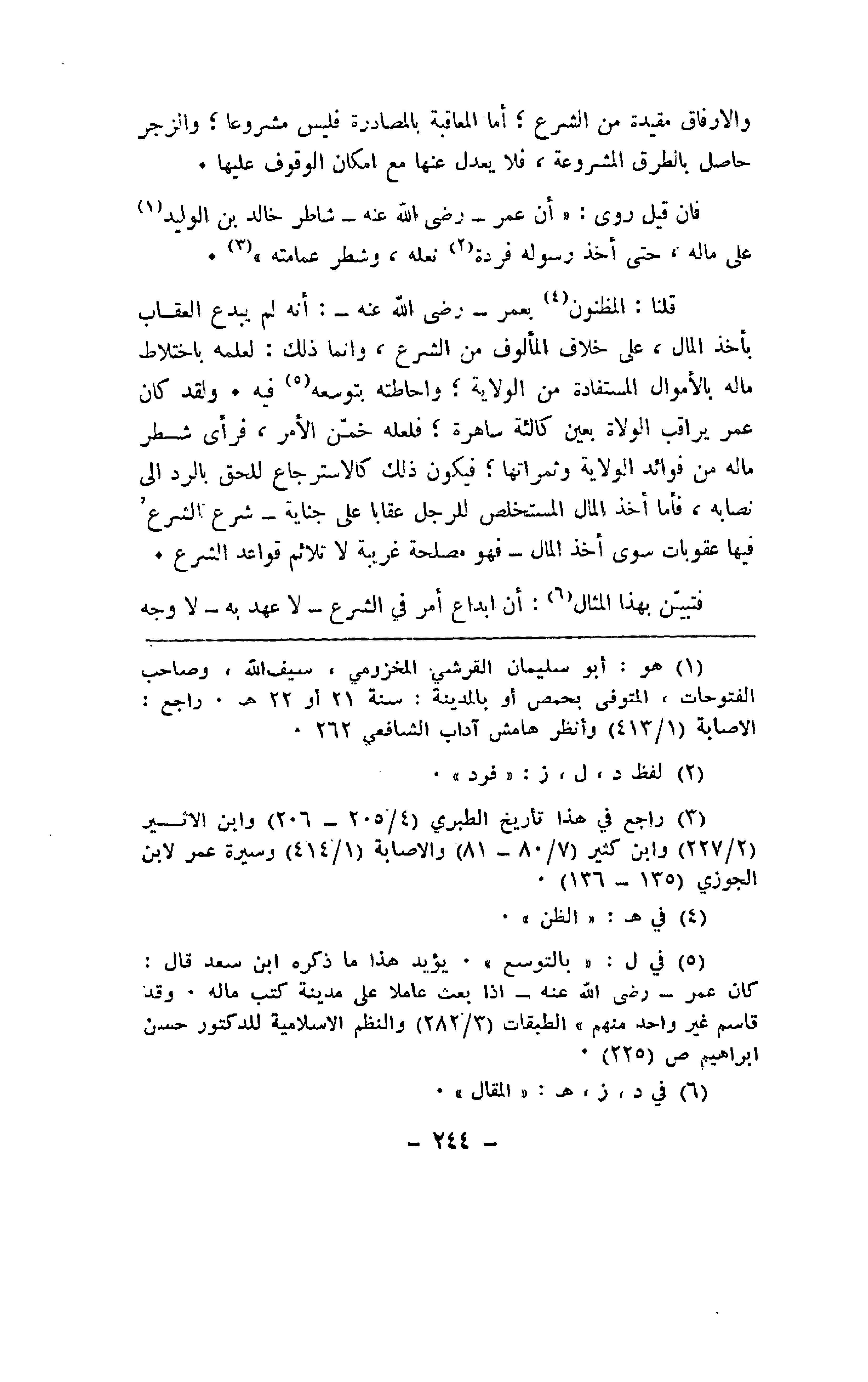 قلنا: المظنون بعمر -رضى الله عنه-: أنه لم يدع العقاب بأخذ المال، على خلاص المألوف من الشرع، وإنما ذلك: لعلمه باختلاط ماله بالأموال المستفادة من الولاية؛ واحاطته بتوسعه فيه. ولقد كان عمر يراقب الولاة بعين كالئة ساهرة؛ فلعله خمن الأمر، فرأى شطر ماله من فوائد الولاية وثمراتها؛ فيكون ذلك كالاسترجاع للحق بالرد إلى نصابه، فأما أخذ المال المستخلص للرجل عقاباً على جناية -شرع الشرع فيها عقوبات سوى اخذ المال- فهو مصلحة غريبة لا تلائم قواعد الشرع.