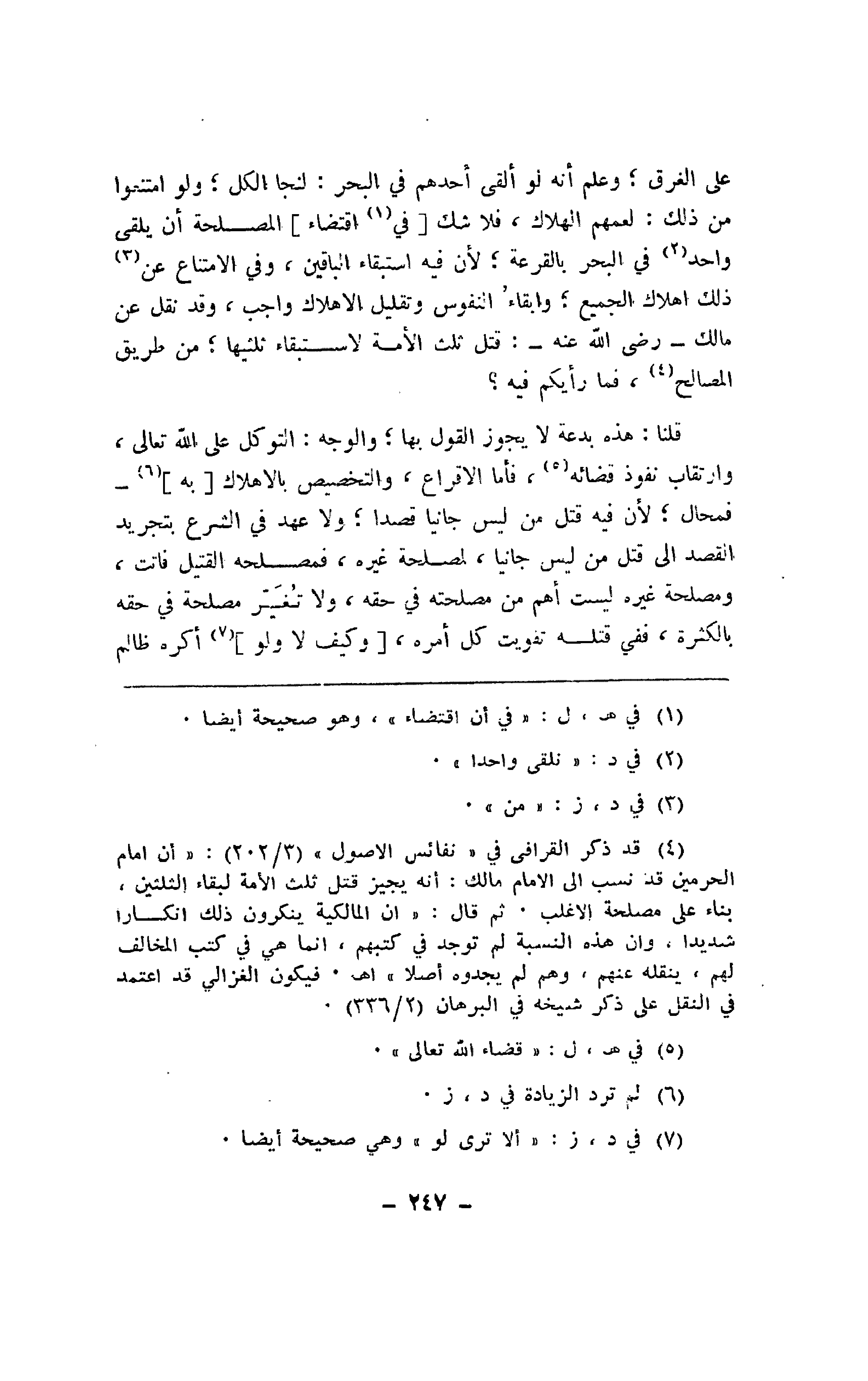 على الغرق؛ علك أنه لو ألقى أحدهم في البحر: لنجا الكل؛ ولو امتنعوا من ذلك: لعمهم الهلاك، فلا شك [في اقتضاء] المصلحة أن يلقى واحد في البحر بالقرعة؛ لأن فيه استبقاء الباقين، وفي الإمتناع عن ذلك إهلاك الجميع؛ وإبقاء النفوس وتقليل الإهلاك واجب، وقد نقل عن مالك -رضى الله عنه-: قتل ثلث الأمة لاستبقاء ثلثيها؛ من طريق المصالح، فما رأيكم فيه؟