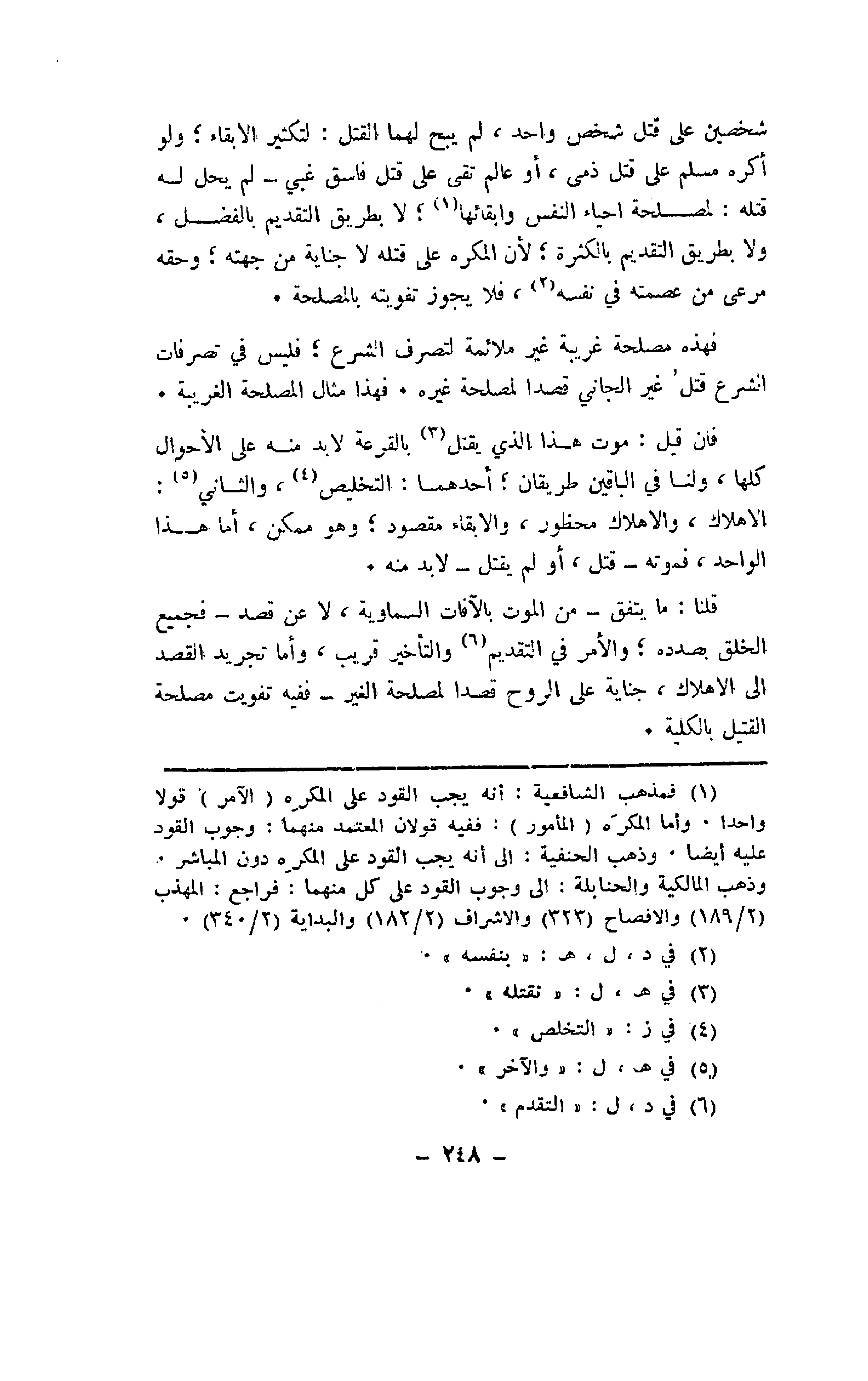 شخصين على قتل شخص واحد، لم يبح لهما القتل: لتكثير الإبقاء؛ ولو أكره مسلم على قتل ذمى، أو عالم تقى على قتل فاسق غبي -لم يحل له قتله: لمصلحة إحياء النفس وإبقائها؛ لا بطريق التقديم بالفضل، ولا بطريق التقديم بالكثرة؛ لأن المكره على قتله لا جناية من جهته؛ وحقه مرعى من عصمته في نفسه، فلا يجوز تفويته بالمصلحة.