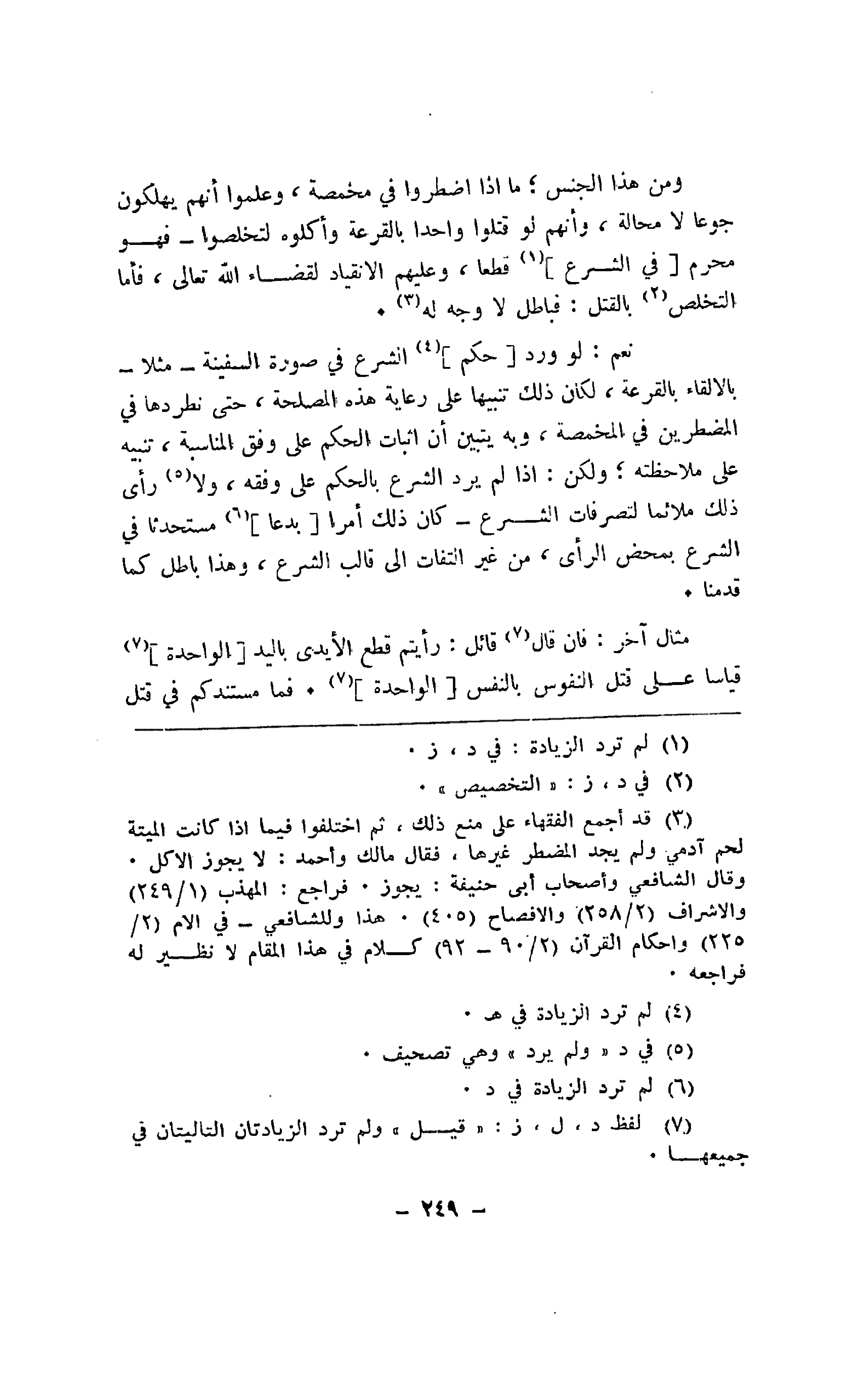 ومن هذا الجنس؛ ما إذا اضطروا في مخمصة، وعملوا أنهم يهلكون جوعاً لا محالة، وأنهم لو قتلوا واحداً بالقرعة وأكلوه لتخلصوا- فهو محرم [في الشرع] قطعاً، وعليهم الإنقياد لقضاء الله تعالى، فأما التخلص بالقتل: فباطل لا وجه له.