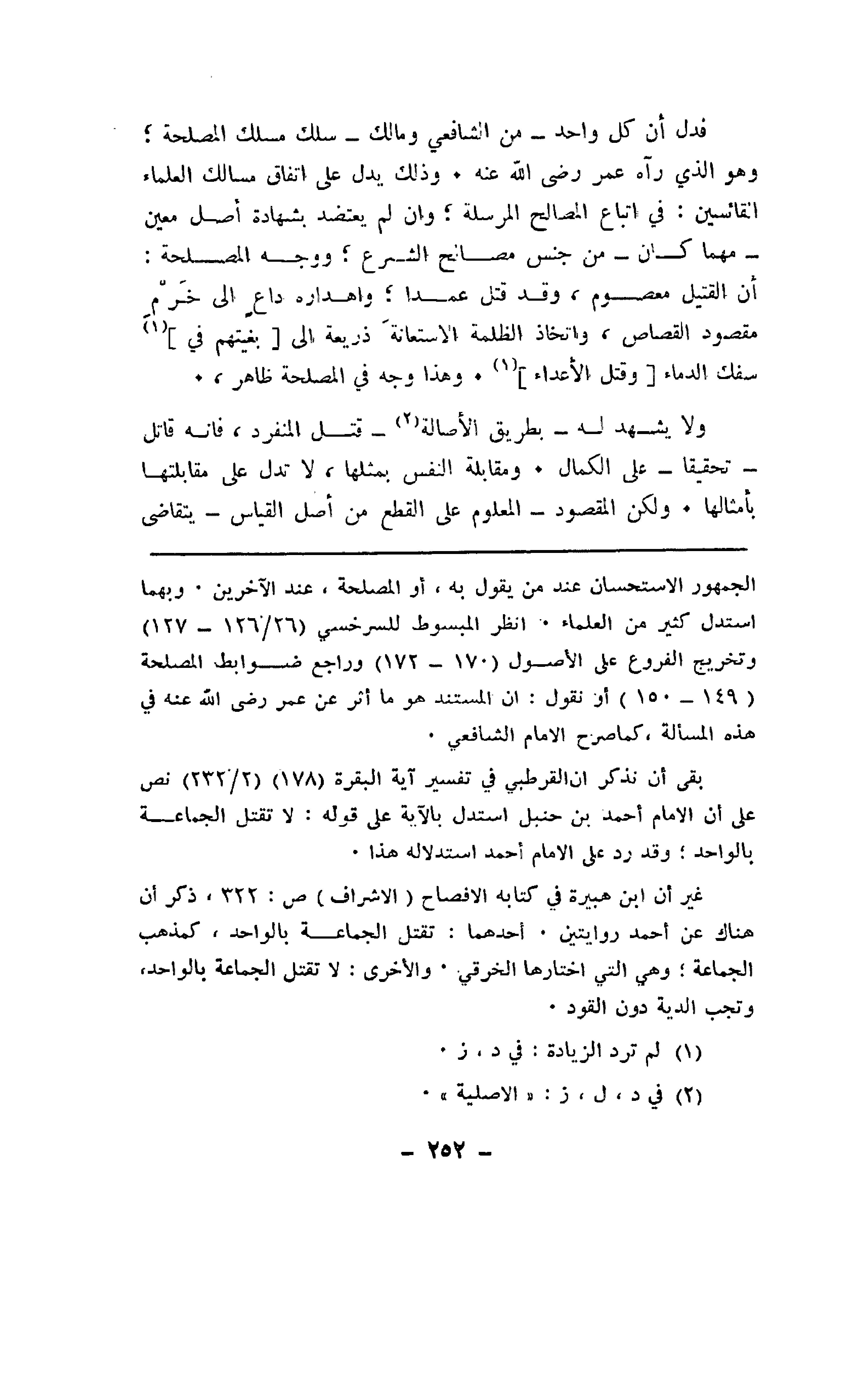 فدل أن كل واحد- من الشافعي ومالك- سلك مسلك المصلحة؛ وهو الذي رآه عمر رضى الله عنه. وذلك يدل على اتفاق مسالك العلماء القائسين: في اتباع المصالح المرسلة؛ وإن لم يعتضد بشهادة أصل معين -مهما كام- من جنس مصالح الشرع؛ ووجه المصلحة: أن القتيل معصوم، وقد قتل عمداً؛ وإهداره داع إلى خرم مقصود القصاص، وإتخاذ الظلمة الإستعانة ذريعة إلى [بغيتهم في] سفك الدماء [وقتل الأعداء]. وهذا وجه في المصلحة ظاهر،.
