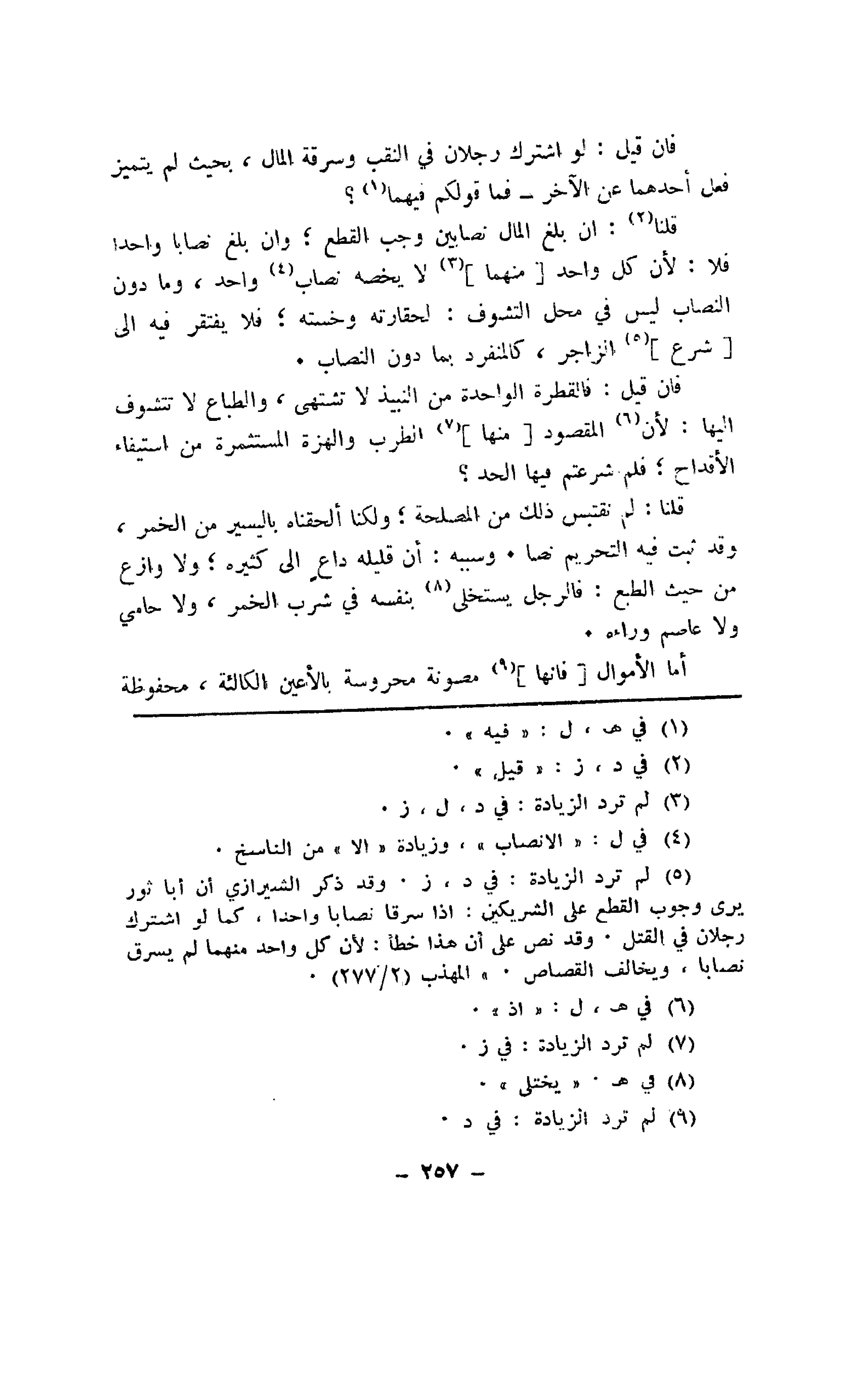 قلنا: إن بلغ المال نصابين وجب القطع؛ وإن بلغ نصابا واحداً فلا: لأن كل واحد [منهما] لا يخصه نصاب واحد، وما دون النصاب ليس في محل التشوف: لحقارته وخسته؛ فلا يفتقر فيه إلى [شرع] الزاجر، كالمنفرد بما دون النصاب.