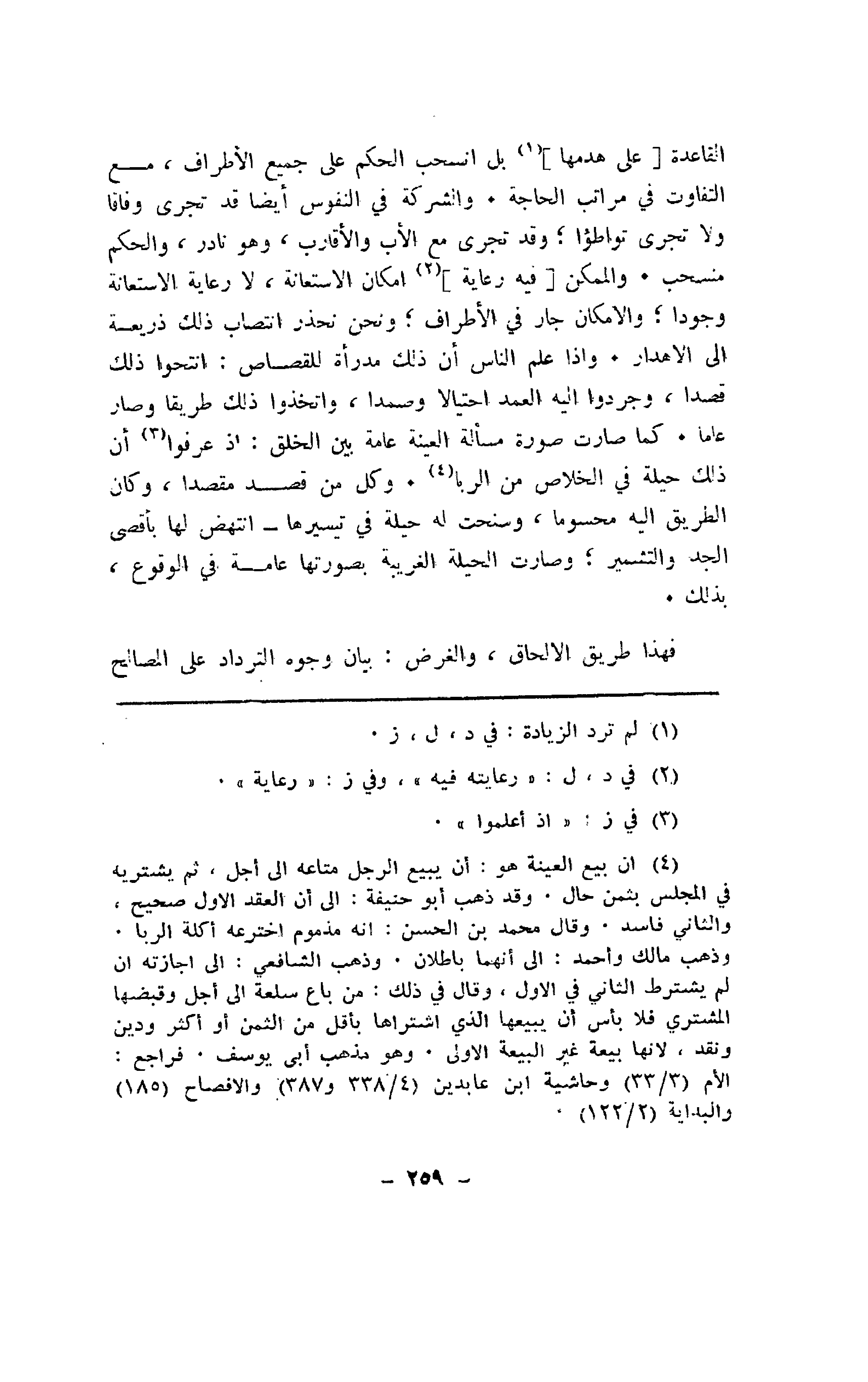 القاعدة [على هدمها] بل انسحب الحكم على جميع الأطراف، مع التفاوت في مراتب الحاجة. والشركة في النفوس أيضاً قد تجرى وفاقاً ولا تجرى تواطؤاً؛ وقد تجرى مع الأب والأقارب، وهو نادر، والحكم منسحب. والممكن [فيه رعاية] إمكان الإستعانة، لا رعاية الإستعانة وجوداً؛ والإمكان جار في الأطراف؛ ونحن نحذر انتصاب ذلك ذريعة إلى الإهدار. وإذا علم الناس أن ذلك مدرأة للقصاص: انتحوا ذلك قصداً، وجردواً إليه العمد احتيالاً وصمداً، واتخذوا ذلك طريقاً وصار عاماً. كما صارت صورة مسألة العينة عامة بين الخلق: إذ عرفوا أن ذلك حيلة في الخلاص من الربا. وكل من قصد مقصداً، وكان الطريق إليه محسوماً، وسنحت له حيلة في تيسيرها- انتهض لها بأقصى الجد والتثمير؛ وصارت الحيلة الغريبة بصورتها عامة في الوقوع، بذلك.